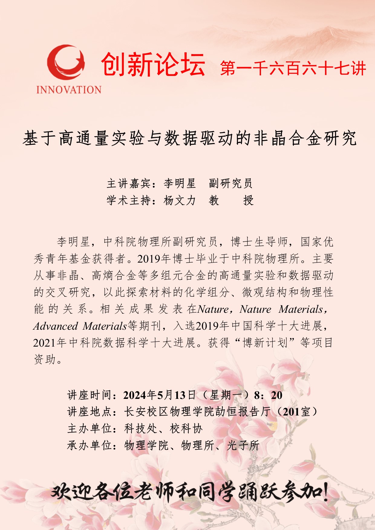 李明星 副研究员 乐动网页版登录入口创新论坛第一千六百六十七讲:基于高通量实验与数据驱动的非晶合金研究 讲座时间 2024年5月13日(星期一)8:20 讲座地点 长安校区物理学院劼恒报告厅(201室) 讲座人介绍 李明星 副研究员 讲座内容