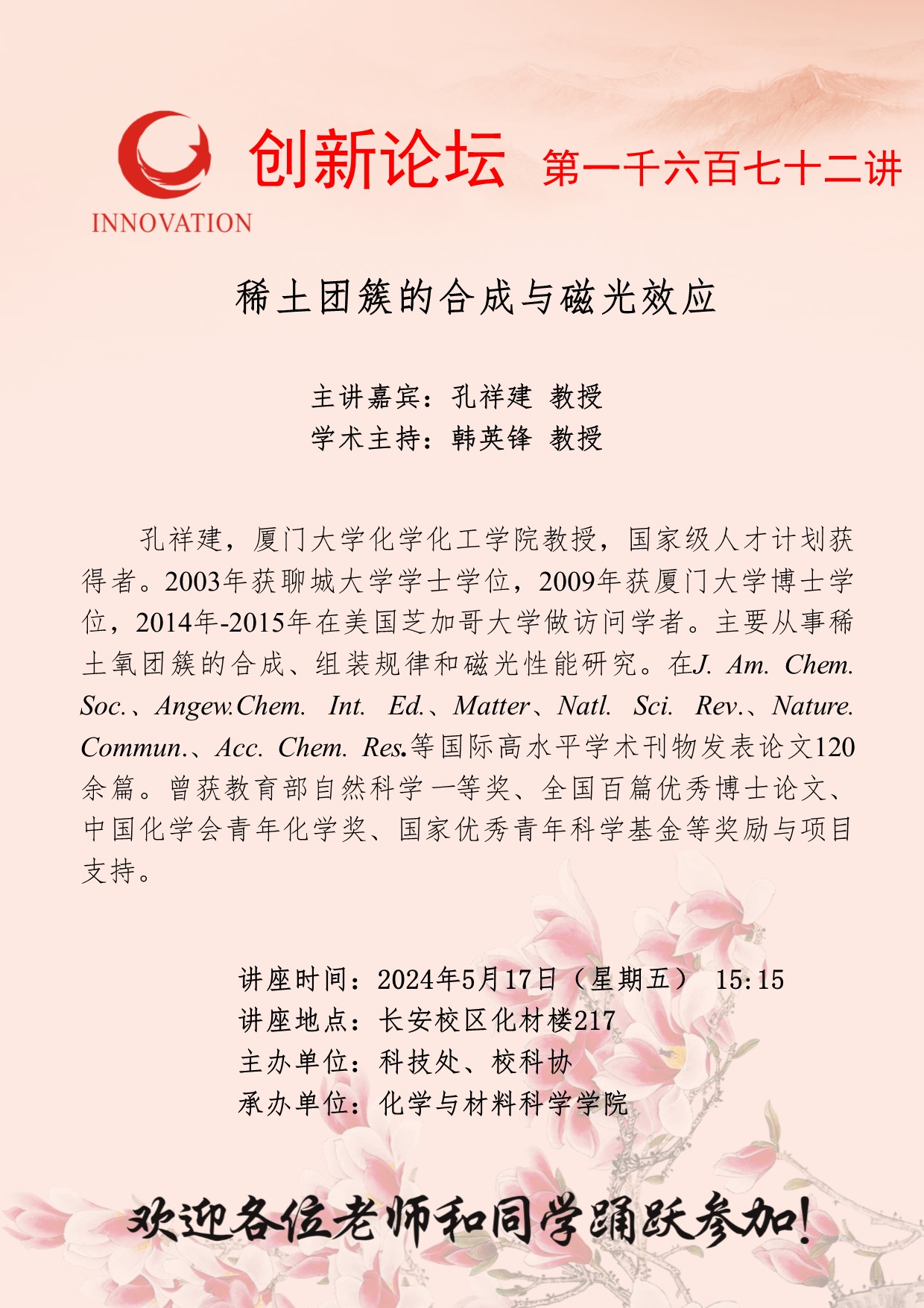 孔祥建 教授 乐动网页版登录入口创新论坛第一千六百七十二讲:稀土团簇的合成与磁光效应 讲座时间 2024年5月17日(星期五) 15:15 讲座地点 长安校区化材楼217 讲座人介绍 孔祥建 教授 讲座内容