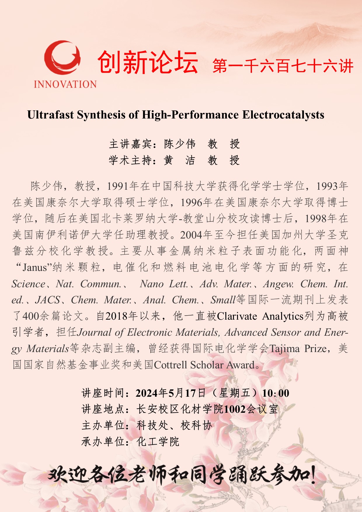 陈少伟 教授 乐动网页版登录入口创新论坛第一千六百七十七讲:Ultrafast Synthesis of High-Performance Electrocatalysts 讲座时间 2024年5月17日(星期五)10:00 讲座地点 长安校区化材学院1002会议室 讲座人介绍 陈少伟 教授 讲座内容