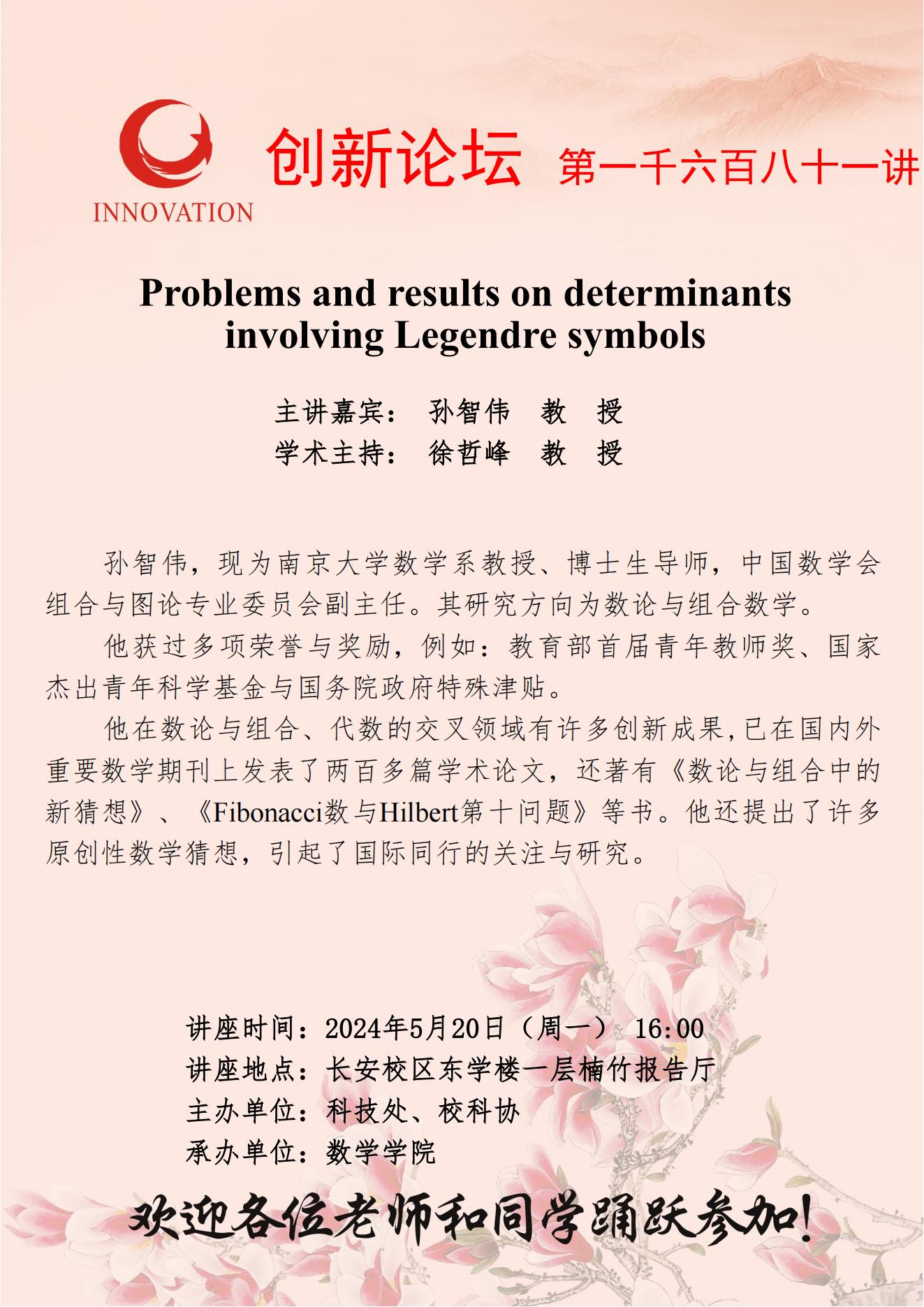 孙智伟 教授 乐动网页版登录入口创新论坛第一千六百八十一讲:Problems and results on determinants involving Legendre symbols 讲座时间 2024年5月20日(星期一) 16:00 讲座地点 长安校区东学楼一层楠竹报告厅 讲座人介绍 孙智伟 教授 讲座内容