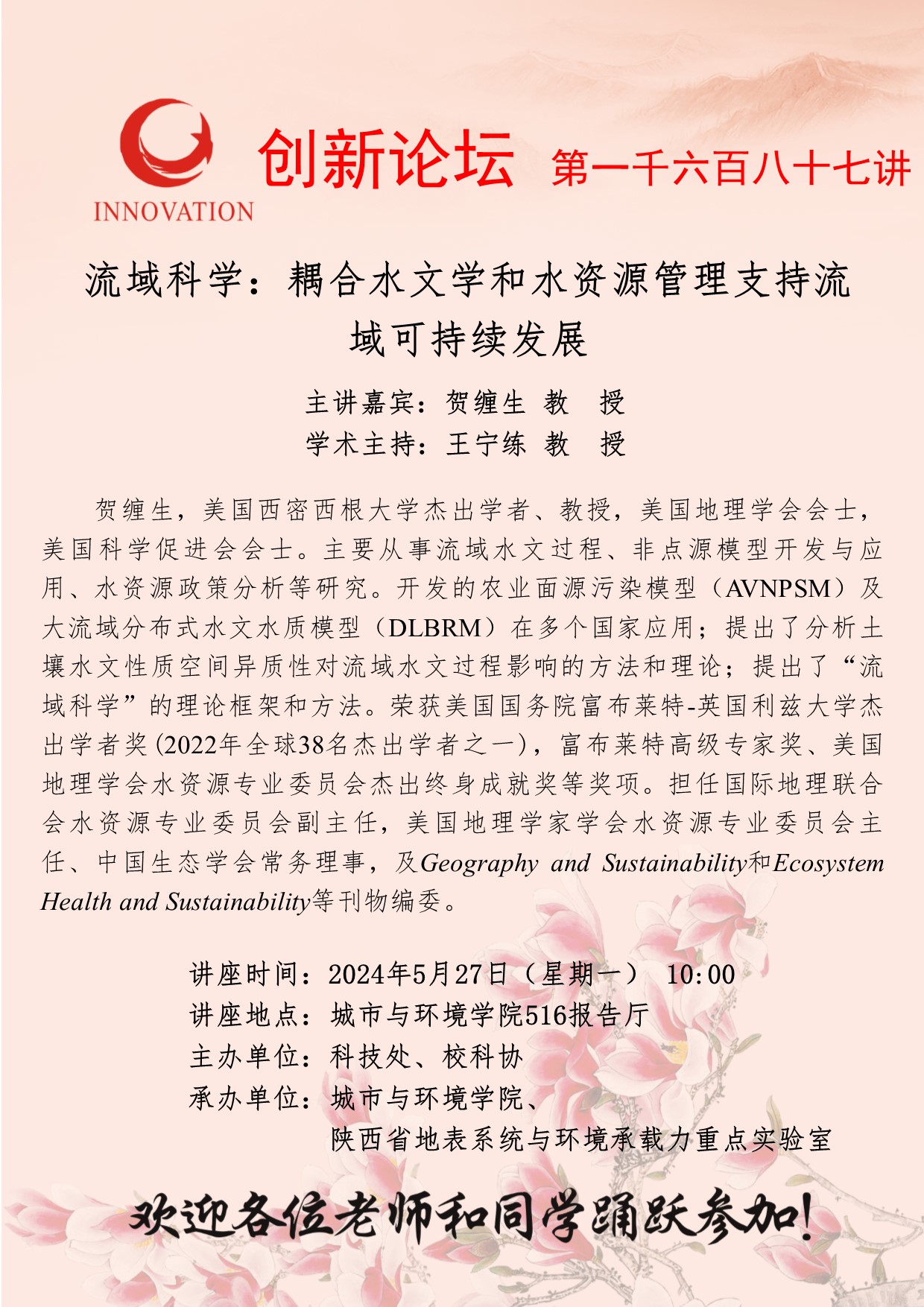贺缠生 教 授 乐动网页版登录入口创新论坛第一千六百八十七讲:流域科学:耦合水文学和水资源管理支持流域可持续发展 讲座时间 2024年5月27日(星期一) 10:00 讲座地点 城市与环境学院516报告厅 讲座人介绍 贺缠生 教 授 讲座内容