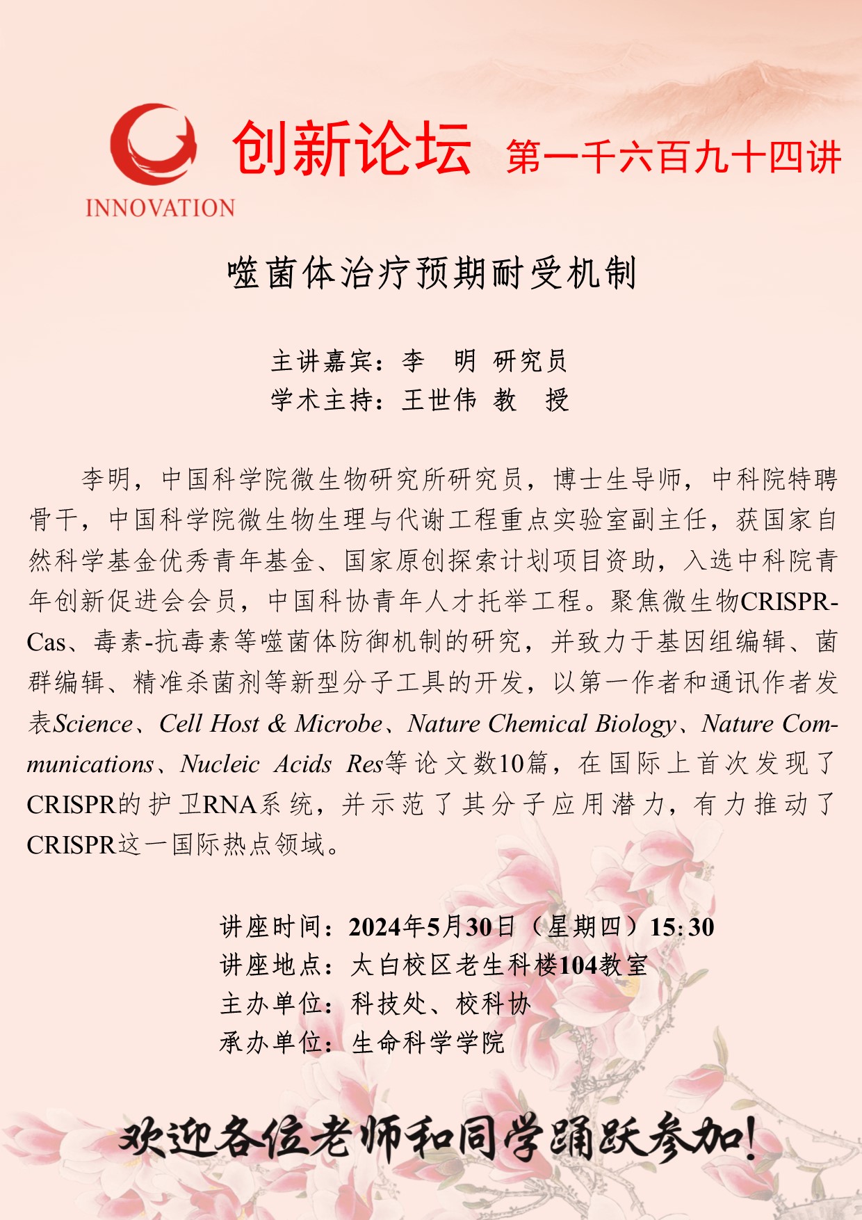 李明 研究员 乐动网页版登录入口创新论坛第一千六百九十四讲:噬菌体治疗预期耐受机制 讲座时间 2024年5月30日(星期四)15:30 讲座地点 太白校区老生科楼104教室 讲座人介绍 李明 研究员 讲座内容