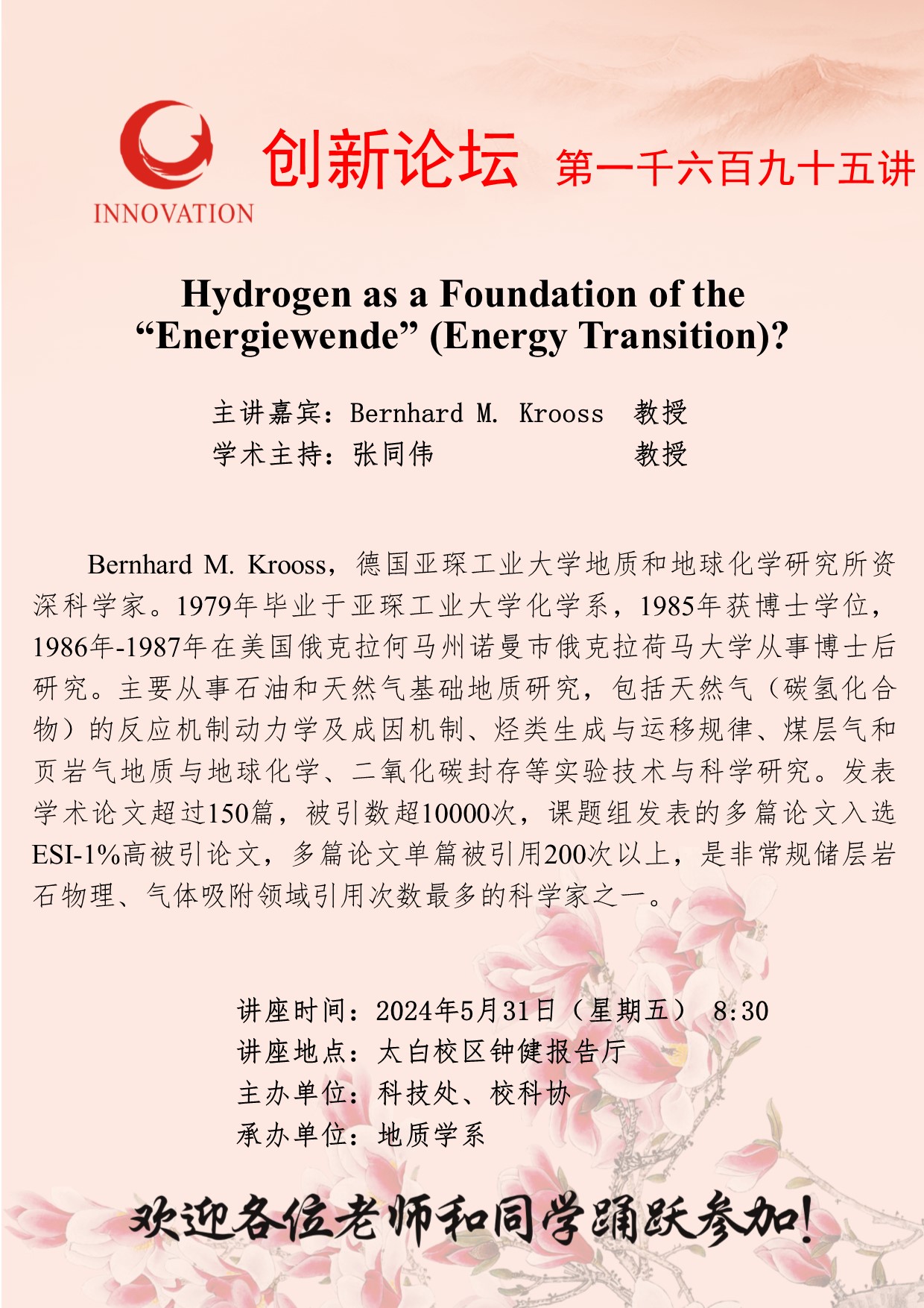 Bernhard M. Krooss 教授 乐动网页版登录入口创新论坛第一千六百九十五讲:Hydrogen as a Foundation of the “Energiewende” (Energy Transition)? 讲座时间 2024年5月31日(星期五) 8:30 讲座地点 太白校区钟健报告厅 讲座人介绍 Bernhard M. Krooss 教授 讲座内容