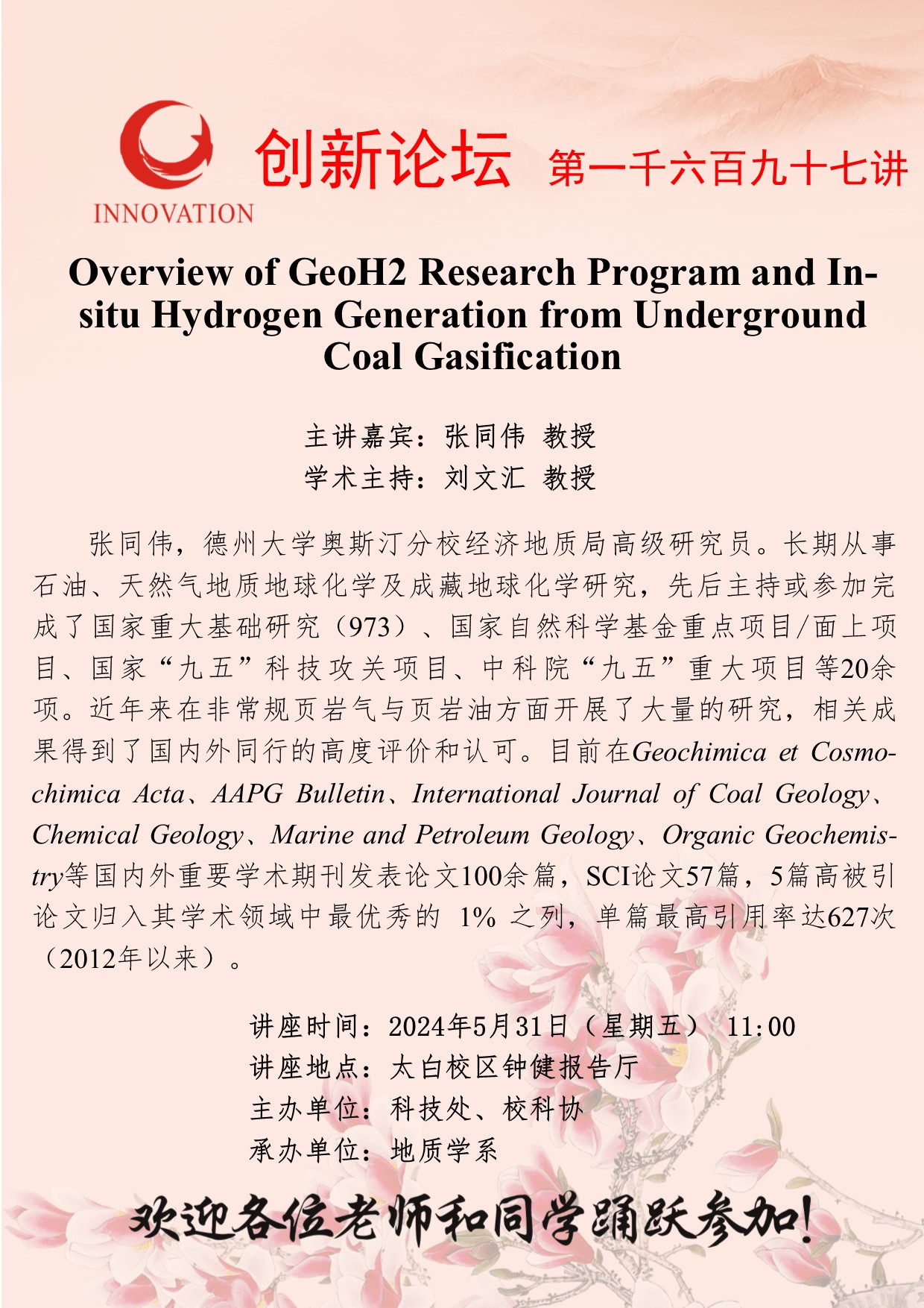 张同伟 教授 乐动网页版登录入口创新论坛第一千六百九十七讲:Overview of GeoH2 Research Program and In-situ Hydrogen Generation from Underground Coal Gasification 讲座时间 2024年5月31日(星期五) 11:00 讲座地点 太白校区钟健报告厅 讲座人介绍 张同伟 教授 讲座内容