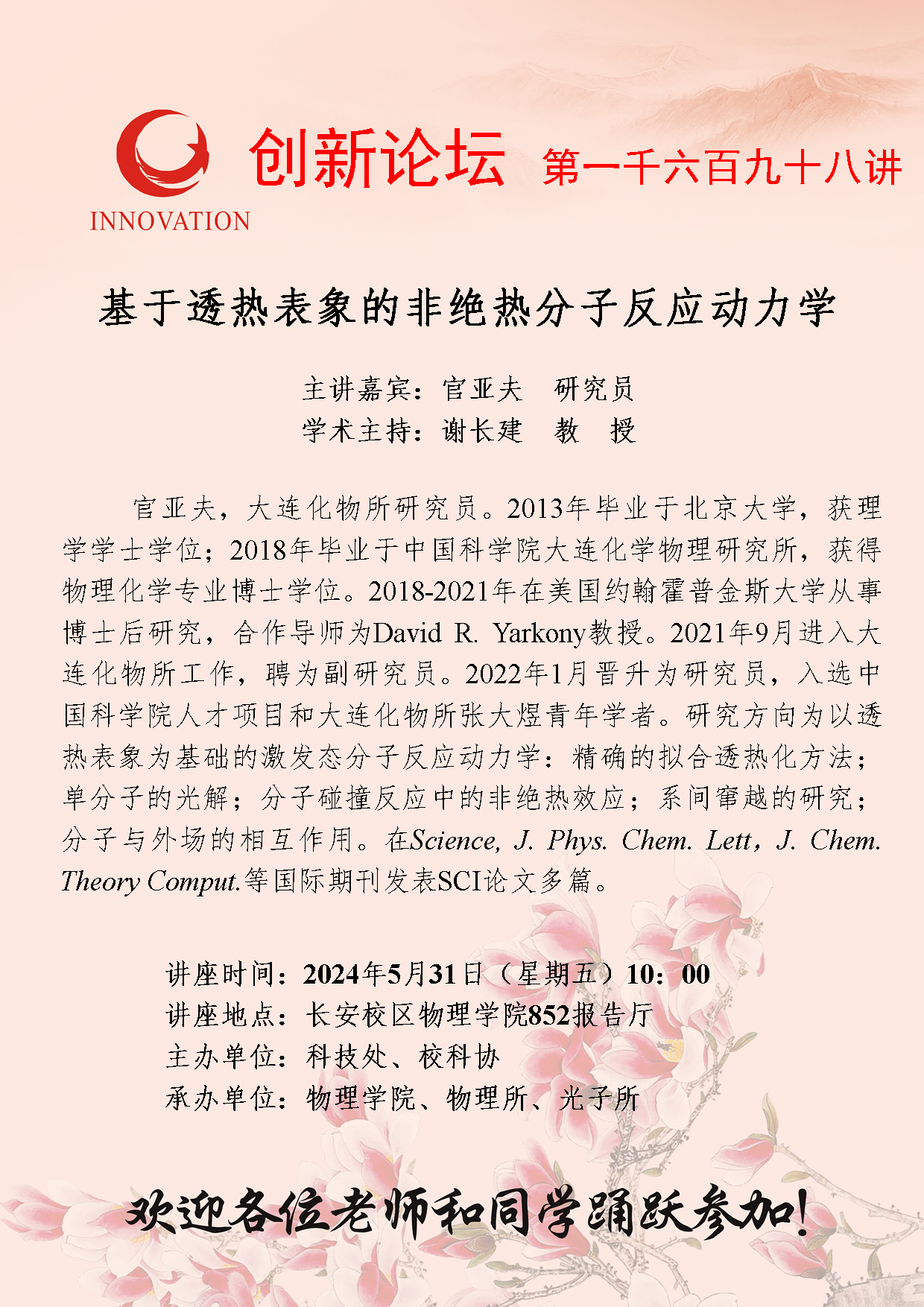 官亚夫 研究员 乐动网页版登录入口创新论坛第一千六百九十八讲:基于透热表象的非绝热分子反应动力学 讲座时间 2024年5月31日(星期五)10:00 讲座地点 长安校区物理学院852报告厅 讲座人介绍 官亚夫 研究员 讲座内容