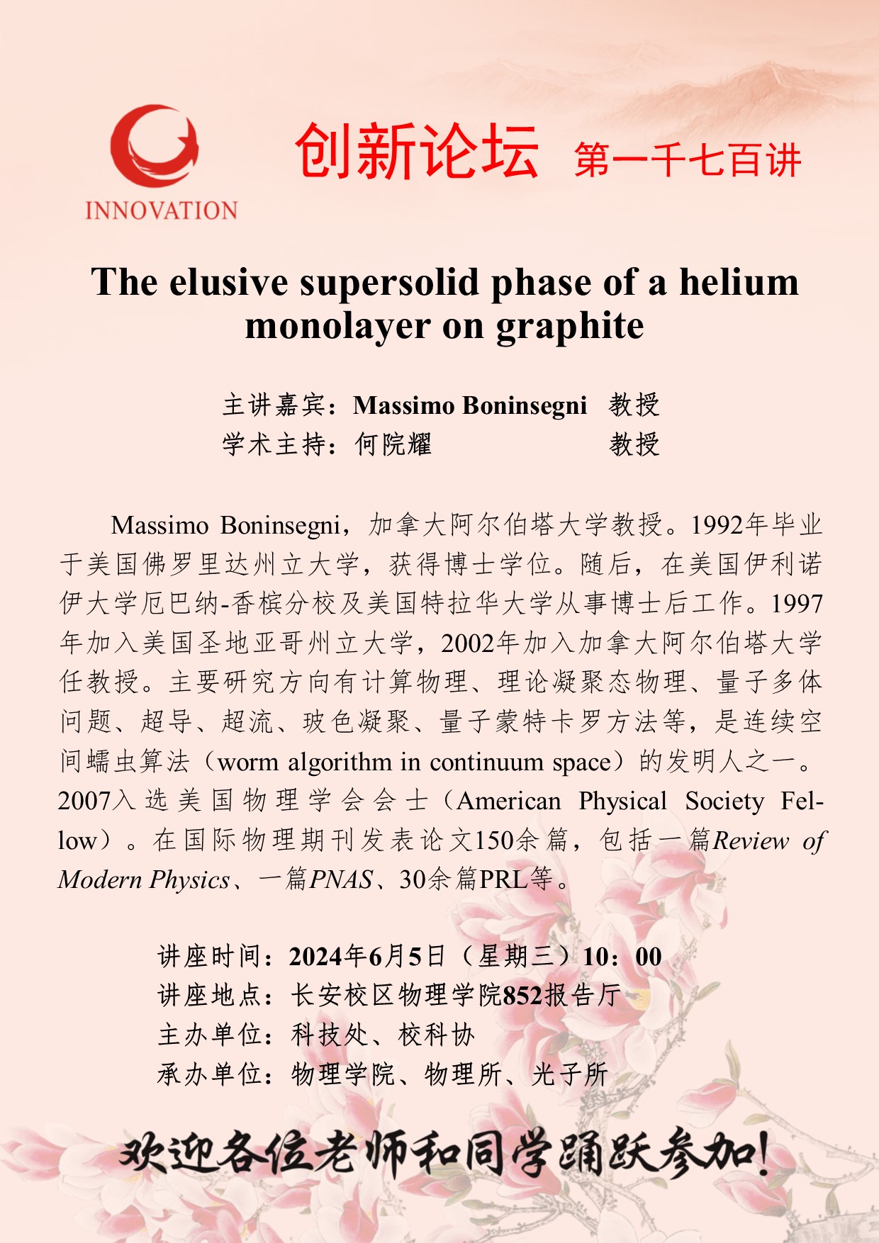 Massimo Boninsegni 教授 乐动网页版登录入口创新论坛第一千七百讲:The elusive supersolid phase of a helium monolayer on graphite 讲座时间 2024年6月5日(星期三)10:00 讲座地点 长安校区物理学院852报告厅 讲座人介绍 Massimo Boninsegni 教授 讲座内容