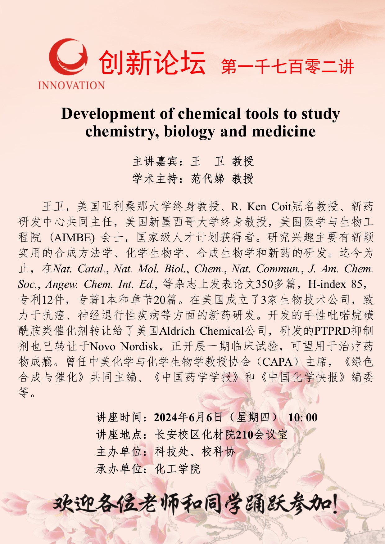 王卫 教授 乐动网页版登录入口创新论坛第一千七百零二讲:Development of chemical tools to study chemistry, biology and medicine 讲座时间 2024年6月6日(星期四) 10: 00 讲座地点 长安校区化材院210会议室 讲座人介绍 王卫 教授 讲座内容