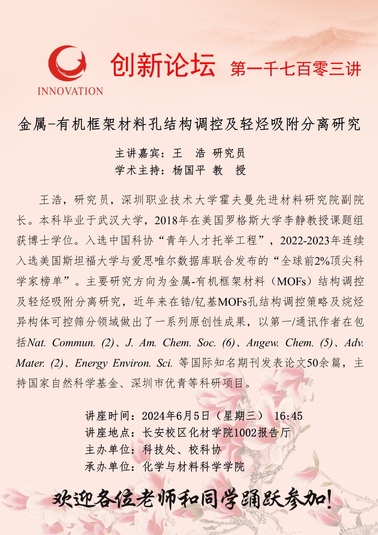王浩 研究员 乐动网页版登录入口创新论坛第一千七百零三讲:金属-有机框架材料孔结构调控及轻烃吸附分离研究 讲座时间 2024年6月5日(星期三) 16:45 讲座地点 长安校区化材学院1002报告厅 讲座人介绍 王浩 研究员 讲座内容