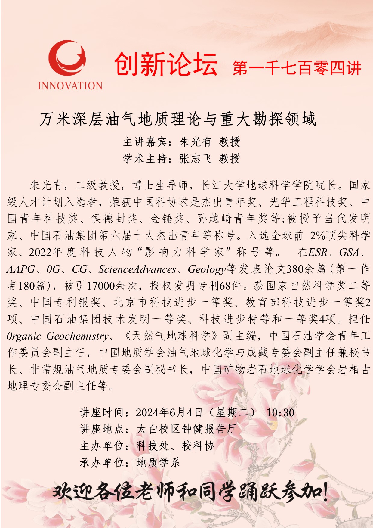 朱光有 教授 乐动网页版登录入口创新论坛第一千七百零四讲:万米深层油气地质理论与重大勘探领域 讲座时间 2024年6月4日(星期二) 10:30 讲座地点 太白校区钟健报告厅 讲座人介绍 朱光有 教授 讲座内容