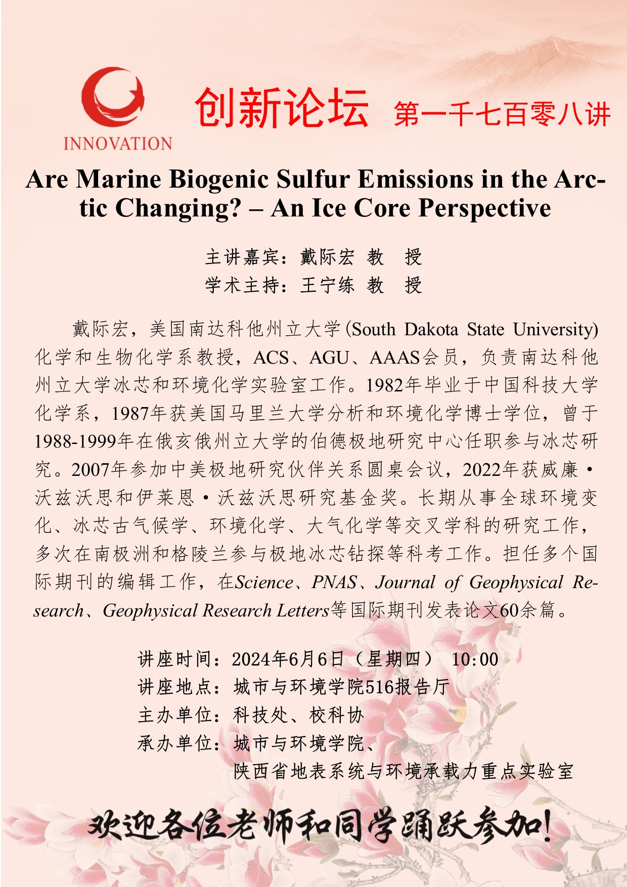戴际宏 教授 乐动网页版登录入口创新论坛第一千七百零八讲:Are Marine Biogenic Sulfur Emissions in the Arctic Changing? – An Ice Core Perspective 讲座时间 2024年6月6日(星期四) 10:00 讲座地点 城市与环境学院516报告厅 讲座人介绍 戴际宏 教授 讲座内容