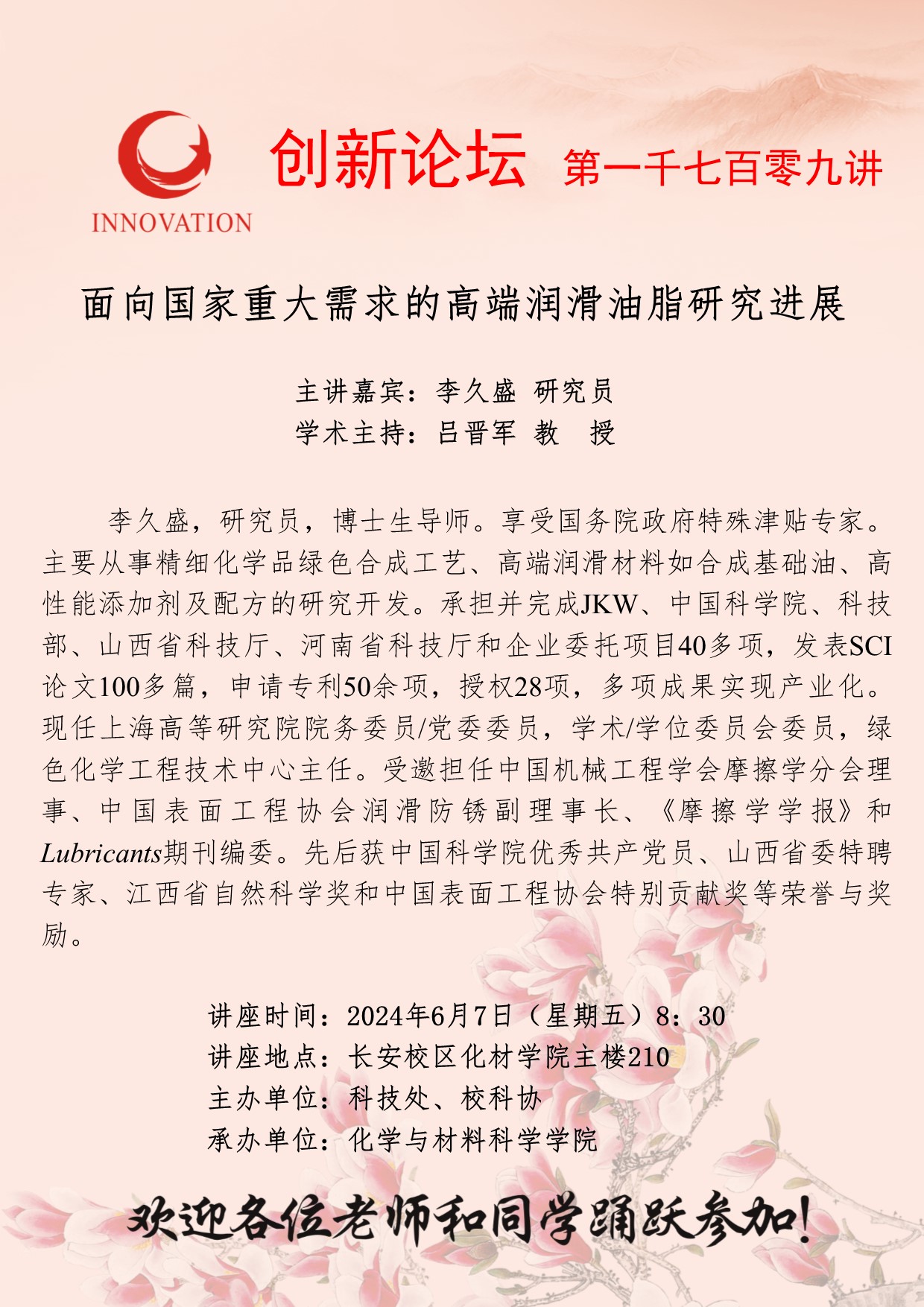 李久盛 研究员 乐动网页版登录入口创新论坛第一千七百零九讲:面向国家重大需求的高端润滑油脂研究进展 讲座时间 2024年6月7日(星期五)8:30 讲座地点 长安校区化材学院主楼210 讲座人介绍 李久盛 研究员 讲座内容