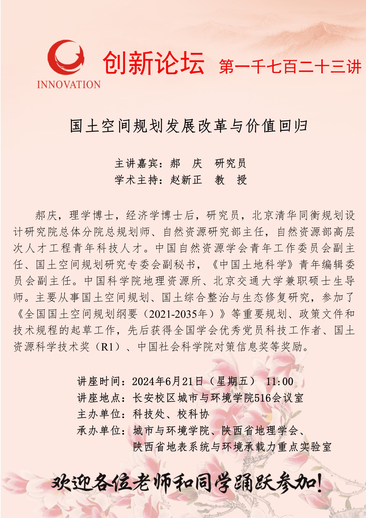 郝庆 研究员 乐动网页版登录入口创新论坛第一千七百二十三讲:国土空间规划发展改革与价值回归 讲座时间 2024年6月21日(星期五) 11:00 讲座地点 长安校区城市与环境学院516会议室 讲座人介绍 郝庆 研究员 讲座内容