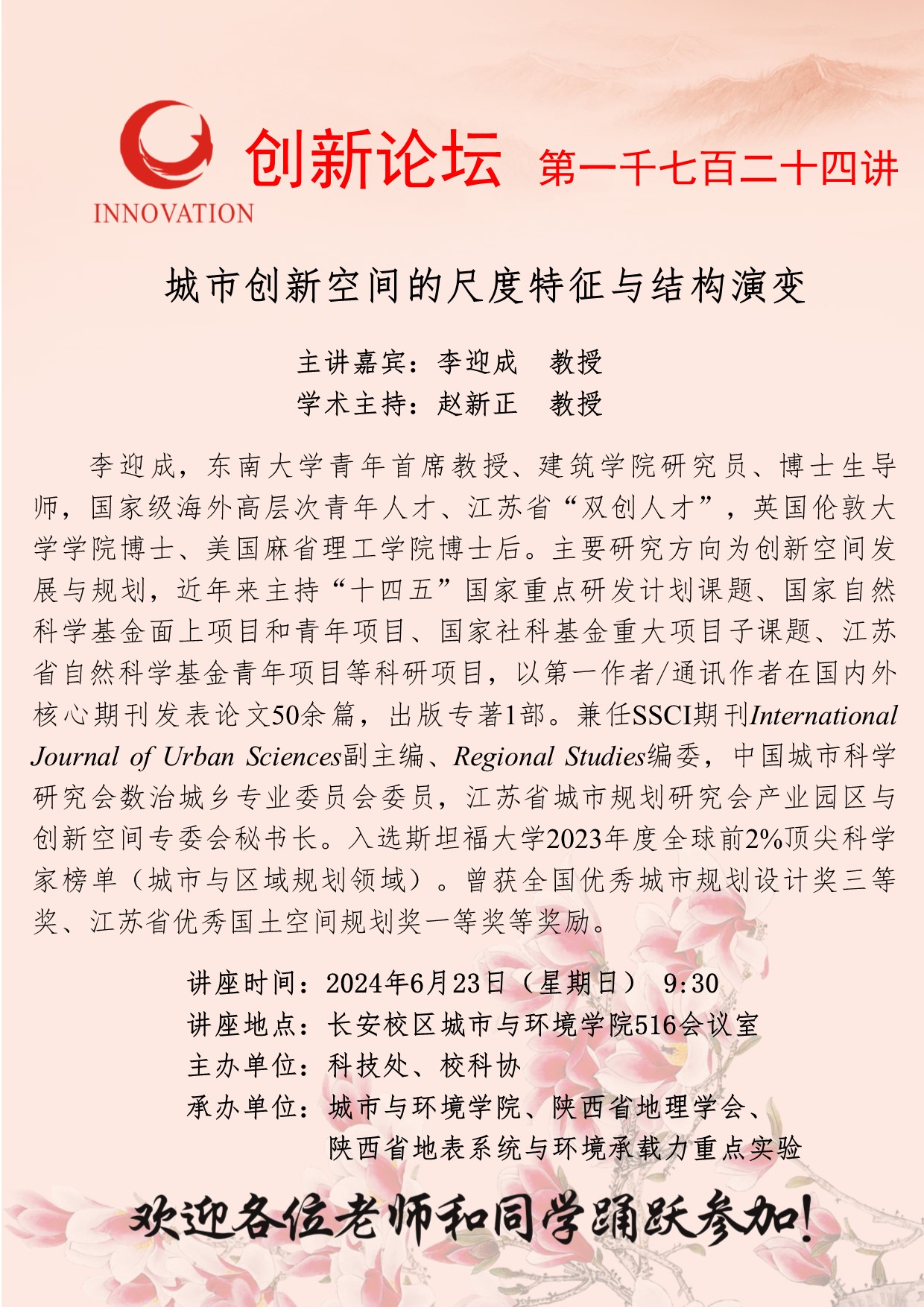 李迎成 教授 乐动网页版登录入口创新论坛第一千七百二十四讲:城市创新空间的尺度特征与结构演变 讲座时间 2024年6月23日(星期日) 9:30 讲座地点 长安校区城市与环境学院516会议室 讲座人介绍 李迎成 教授 讲座内容