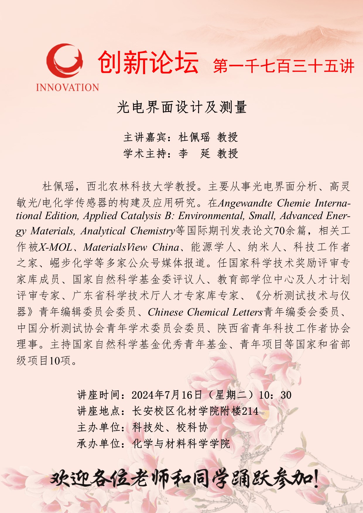 杜佩瑶 教授 乐动网页版登录入口创新论坛第一千七百三十五讲:光电界面设计及测量 讲座时间 2024年7月16日(星期二)10:30 讲座地点 长安校区化材学院附楼214 讲座人介绍 杜佩瑶 教授 讲座内容