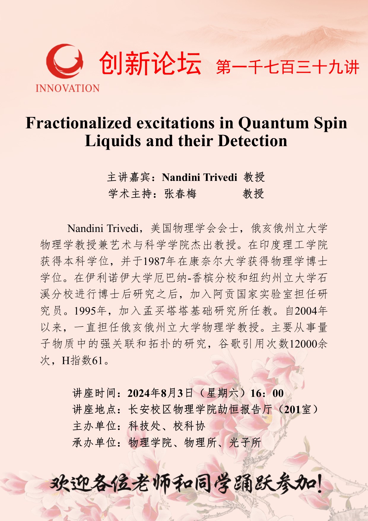 Nandini Trivedi 教授 乐动网页版登录入口创新论坛第一千七百三十九讲:Fractionalized excitations in Quantum Spin Liquids and their Detection 讲座时间 2024年8月3日(星期六)16:00 讲座地点 长安校区物理学院劼恒报告厅(201室) 讲座人介绍 Nandini Trivedi 教授 讲座内容