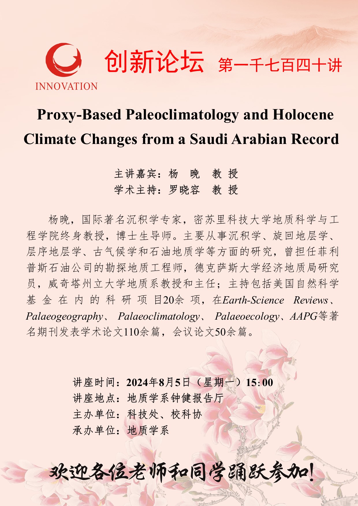 杨晚 教授 乐动网页版登录入口创新论坛第一千七百四十讲: Proxy-Based Paleoclimatology and Holocene Climate Changes from a Saudi Arabian Record 讲座时间 2024年8月5日(星期一)15:00 讲座地点 地质学系钟健报告厅 讲座人介绍 杨晚 教授 讲座内容