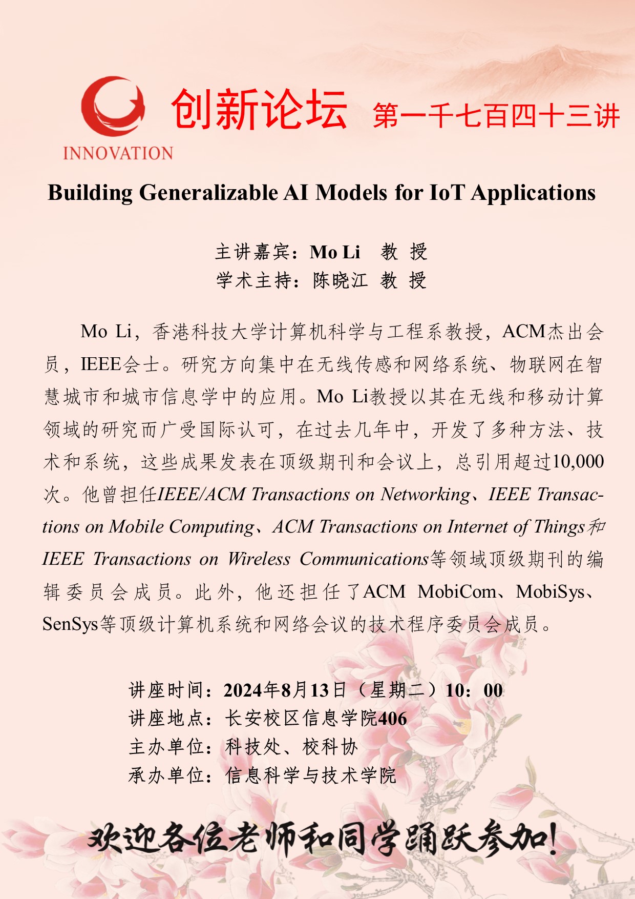 Mo Li 教授 乐动网页版登录入口创新论坛第一千七百四十三讲:Building Generalizable AI Models for IoT Applications 讲座时间 2024年8月13日(星期二)10:00 讲座地点 长安校区信息学院406 讲座人介绍 Mo Li 教授 讲座内容
