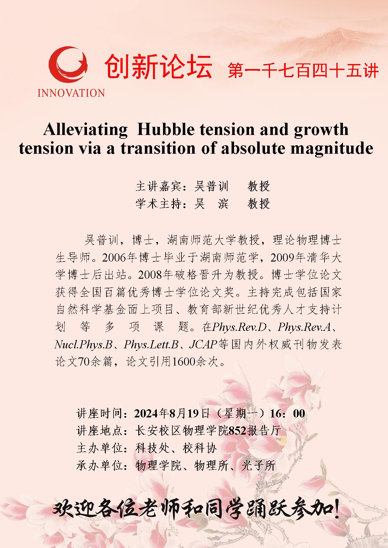 吴普训 教授 乐动网页版登录入口创新论坛第一千七百四十五讲:Alleviating Hubble tension and growth tension via a transition of absolute magnitude 讲座时间 2024年8月19日(星期一)16:00 讲座地点 长安校区物理学院852报告厅 讲座人介绍 吴普训 教授 讲座内容