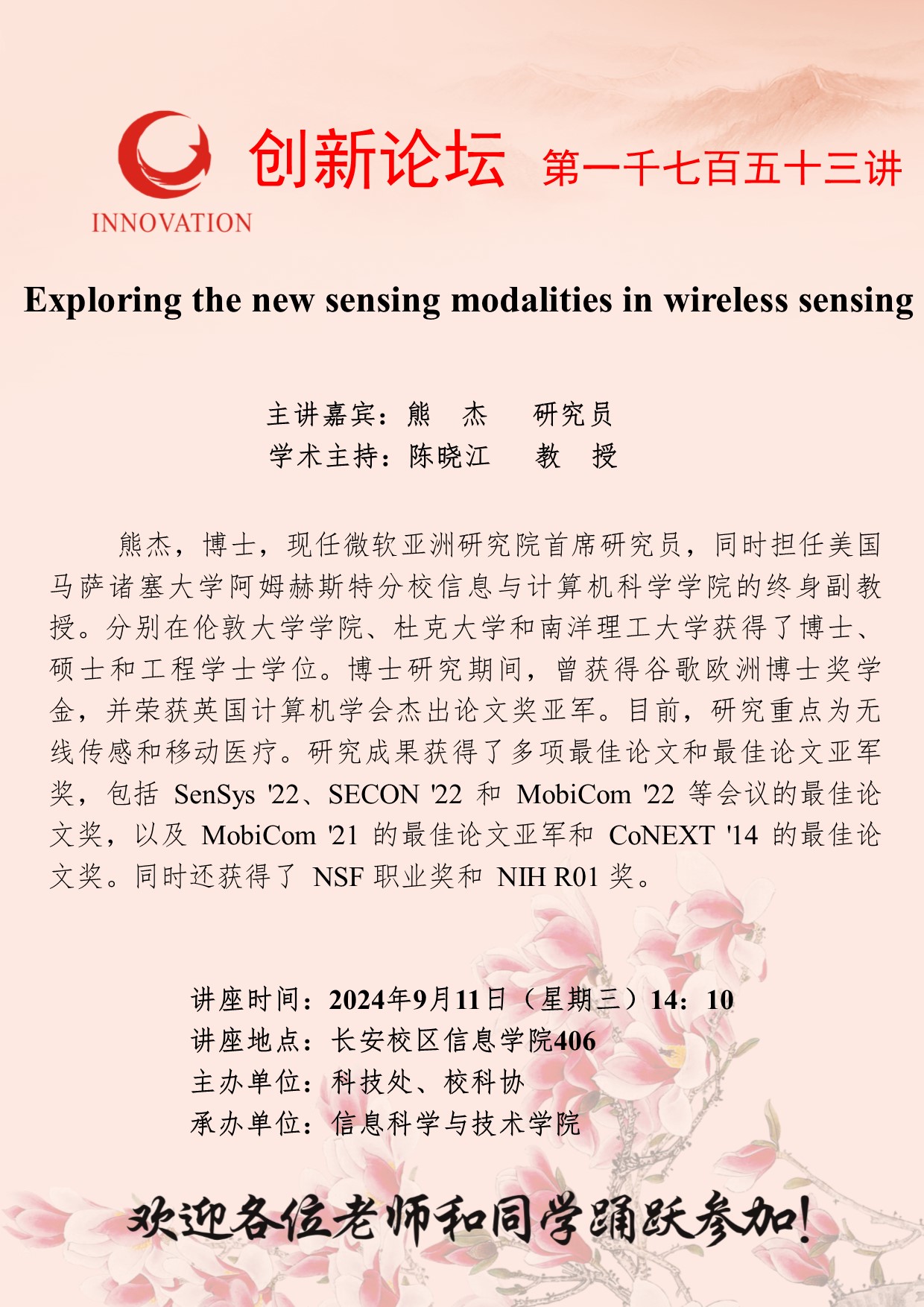 熊杰 研究员 乐动网页版登录入口创新论坛第一千七百五十三讲:Exploring the new sensing modalities in wireless sensing 讲座时间 2024年9月11日(星期三)14:10 讲座地点 长安校区信息学院406 讲座人介绍 熊杰 研究员 讲座内容