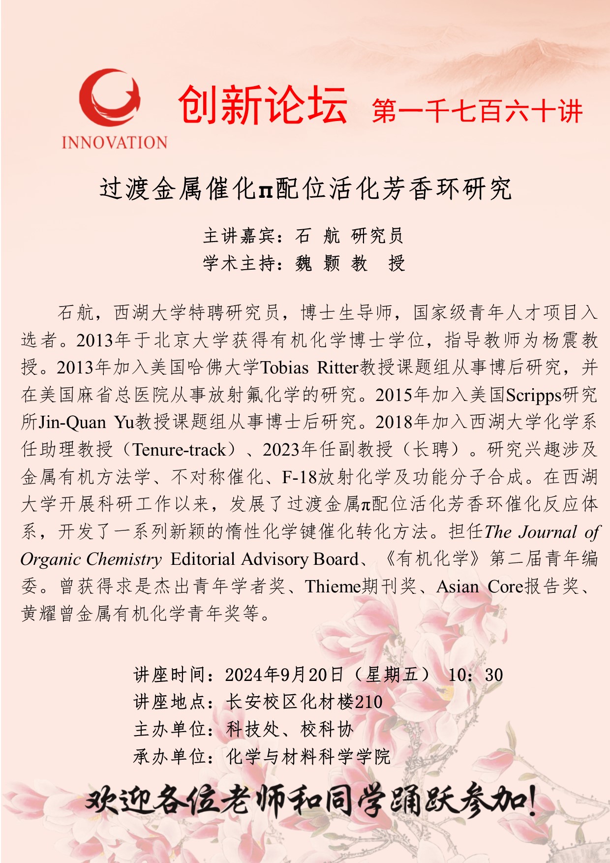 石航 研究员 乐动网页版登录入口创新论坛第一千七百六十讲:过渡金属催化π配位活化芳香环研究 讲座时间 2024年9月20日(星期五) 10:30 讲座地点 长安校区化材楼210 讲座人介绍 石航 研究员 讲座内容