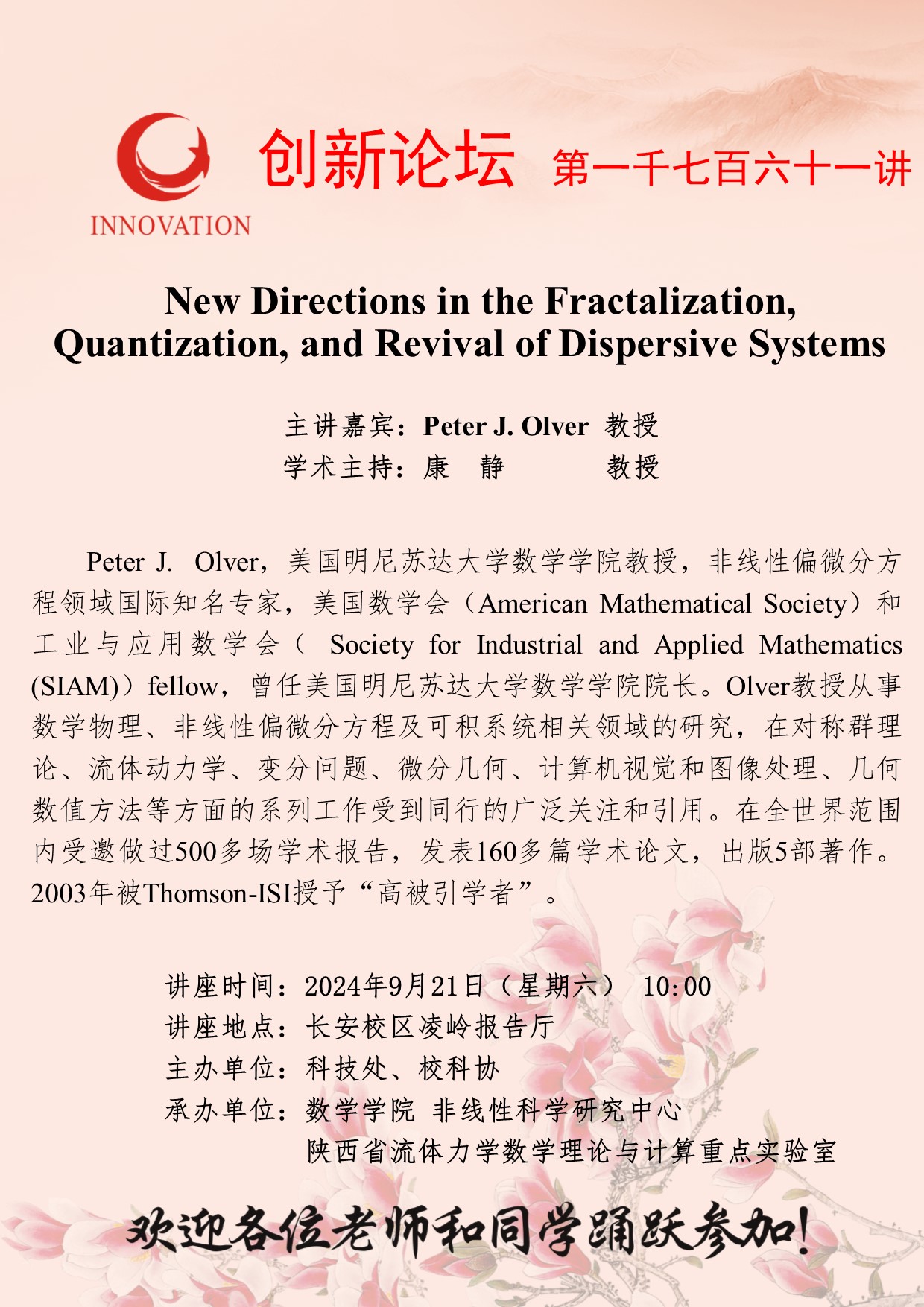 Peter J. Olver 教授 乐动网页版登录入口创新论坛第一千七百六十一讲:New Directions in the Fractalization,Quantization, and Revival of Dispersive Systems 讲座时间 2024年9月21日(星期六) 10:00 讲座地点 长安校区凌岭报告厅 讲座人介绍 Peter J. Olver 教授 讲座内容