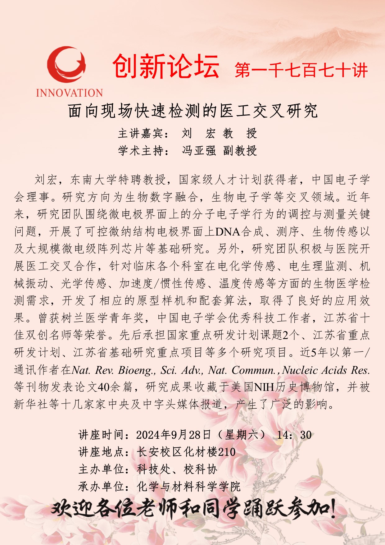 刘宏 教授 乐动网页版登录入口创新论坛第一千七百七十讲:面向现场快速检测的医工交叉研究 讲座时间 2024年9月28日(星期六) 14:30 讲座地点 长安校区化材楼210 讲座人介绍 刘宏 教授 讲座内容