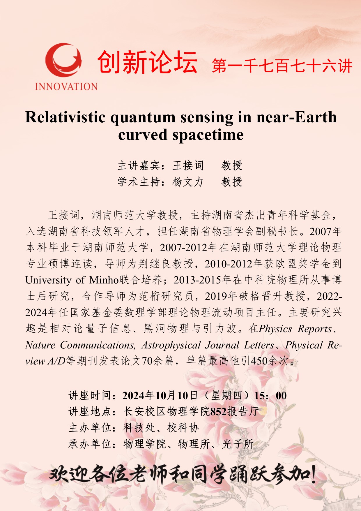 王接词 教授 乐动网页版登录入口创新论坛第一千七百七十六讲:Relativistic quantum sensing in near-Earth curved spacetime 讲座时间 2024年10月10日(星期四)15:00 讲座地点 长安校区物理学院852报告厅 讲座人介绍 王接词 教授 讲座内容