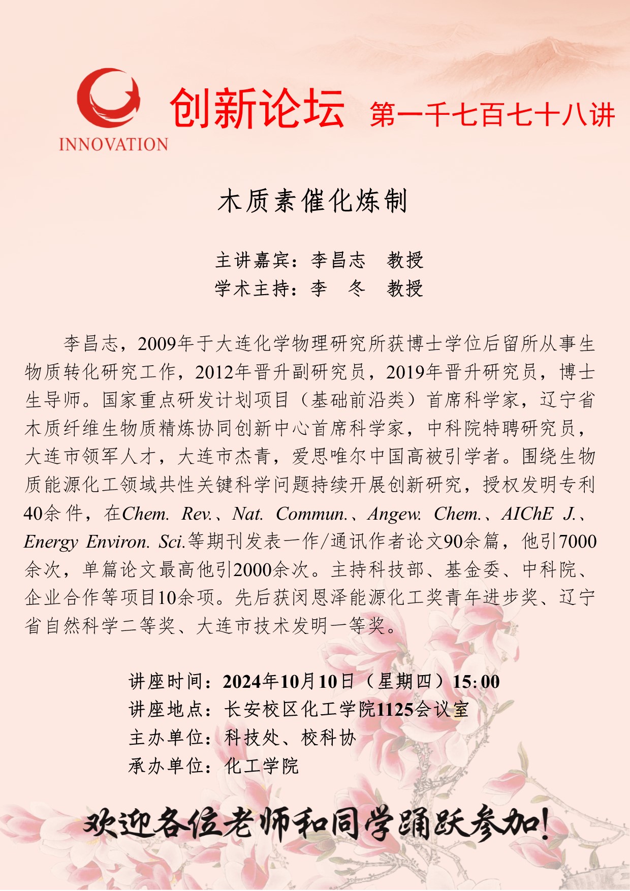 李昌志 教授 乐动网页版登录入口创新论坛第一千七百七十八讲:木质素催化炼制 讲座时间 2024年10月10日(星期四)15:00 讲座地点 长安校区化工学院1125会议室 讲座人介绍 李昌志 教授 讲座内容
