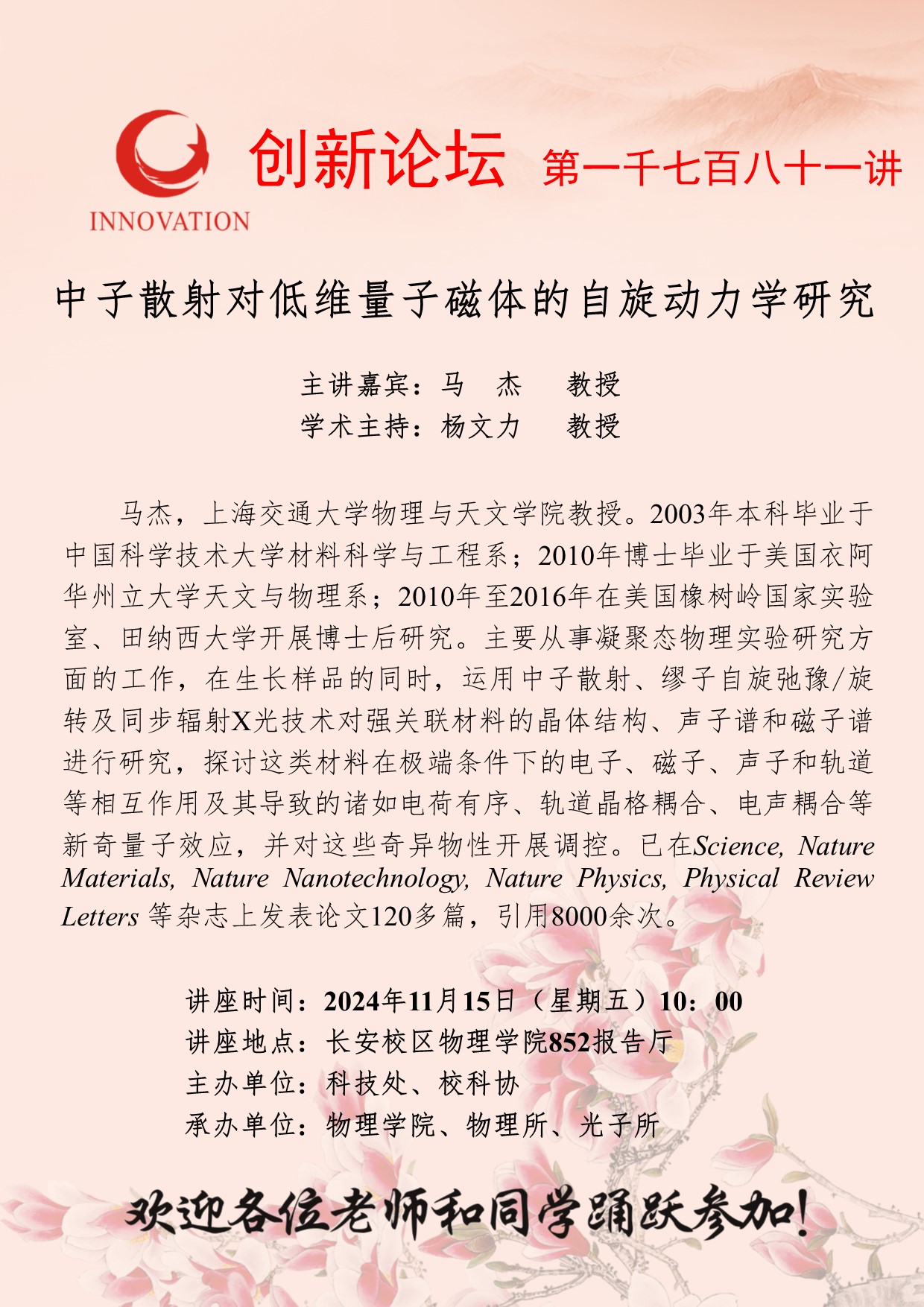 马杰 教授 乐动网页版登录入口创新论坛第一千七百八十一讲:中子散射对低维量子磁体的自旋动力学研究 讲座时间 2024年11月15日(星期五)10:00 讲座地点 长安校区物理学院852报告厅 讲座人介绍 马杰 教授 讲座内容