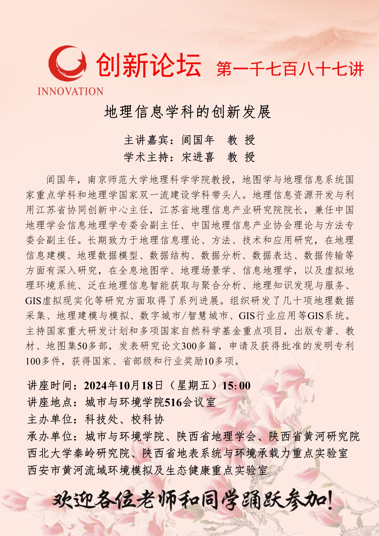 闾国年 教授 乐动网页版登录入口创新论坛第一千七百八十七讲:地理信息学科的创新发展 讲座时间 2024年10月18日(星期五)15:00 讲座地点 城市与环境学院516会议室 讲座人介绍 闾国年 教授 讲座内容