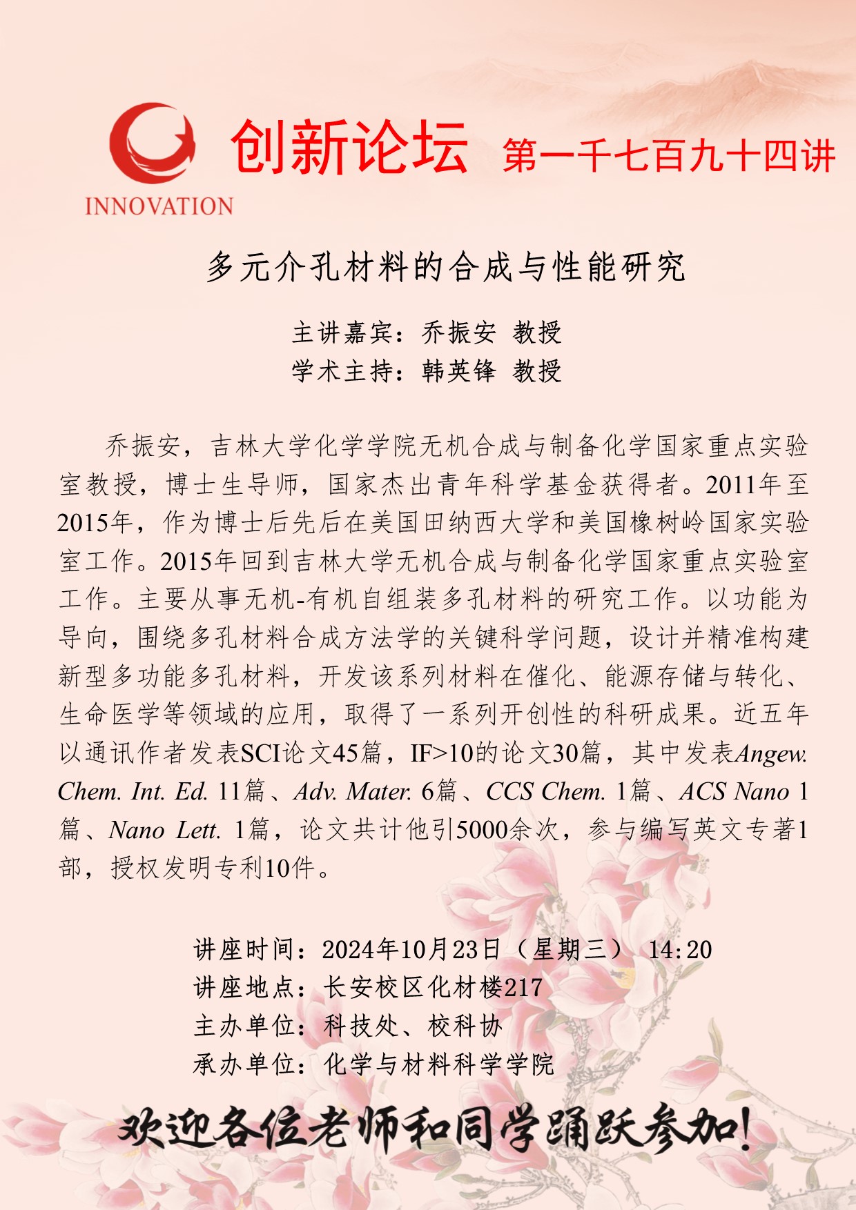 乔振安 教授 乐动网页版登录入口创新论坛第一千七百九十四讲:多元介孔材料的合成与性能研究 讲座时间 2024年10月23日(星期三) 14:20 讲座地点 长安校区化材楼217 讲座人介绍 乔振安 教授 讲座内容