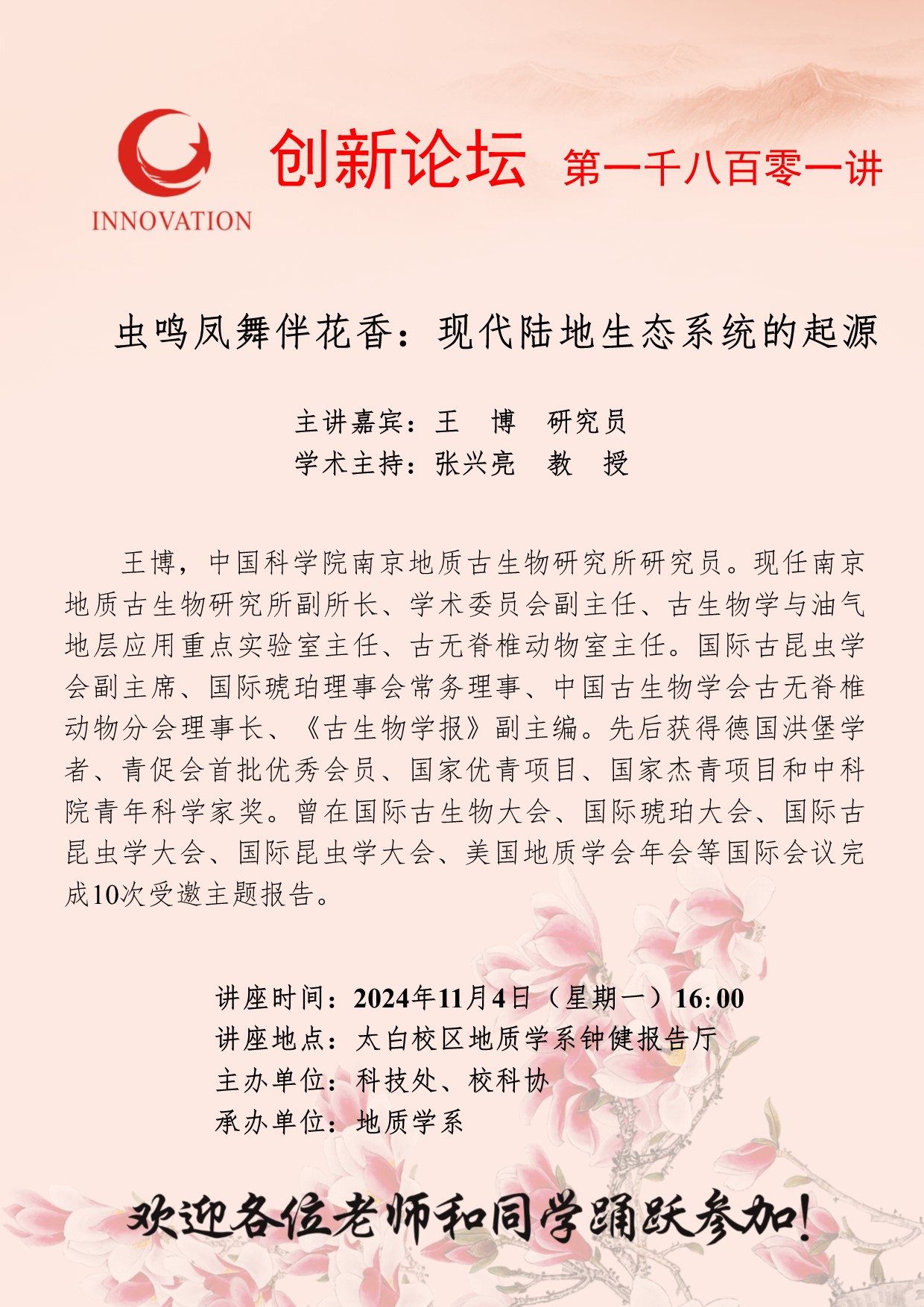 王 博 研究员 乐动网页版登录入口创新论坛第一千八百零一讲:虫鸣凤舞伴花香:现代陆地生态系统的起源 讲座时间 2024年11月4日(星期一)16:00 讲座地点 太白校区地质学系钟健报告厅 讲座人介绍 王 博 研究员 讲座内容