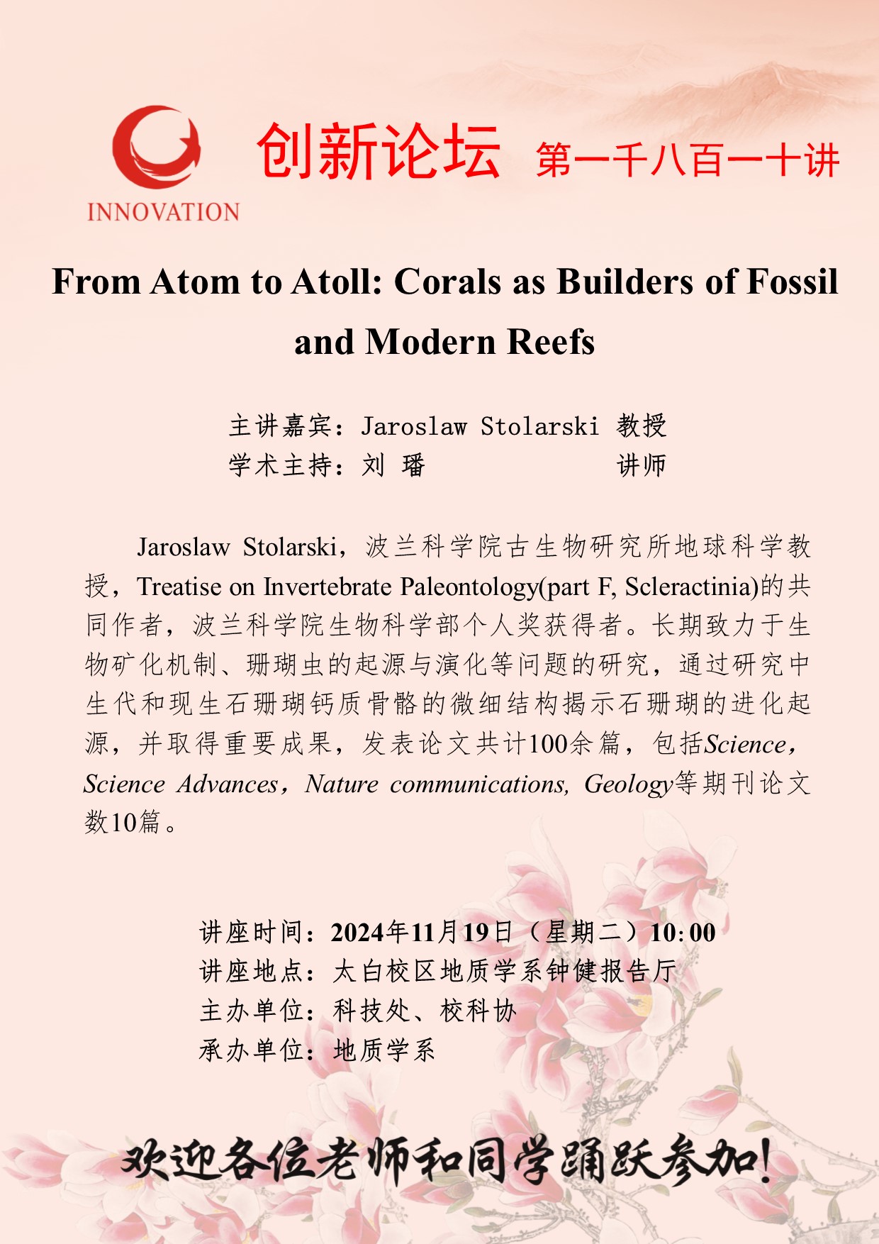 Jaroslaw Stolarski 教授 乐动网页版登录入口创新论坛第一千八百一十讲:From Atom to Atoll: Corals as Builders of Fossil and Modern Reefs 讲座时间 2024年11月19日(星期二)10:00 讲座地点 太白校区地质学系钟健报告厅 讲座人介绍 Jaroslaw Stolarski 教授 讲座内容