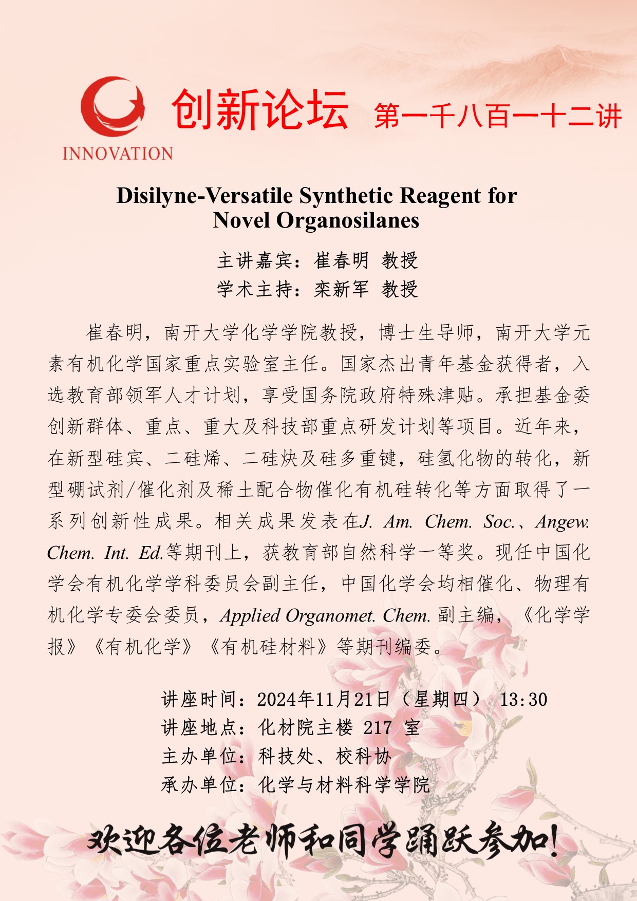 崔春明 教授 乐动网页版登录入口创新论坛第一千八百一十二讲:Disilyne-Versatile Synthetic Reagent for 讲座时间 2024年11月21日(星期四) 13:30 讲座地点 化材院主楼 217 室 讲座人介绍 崔春明 教授 讲座内容