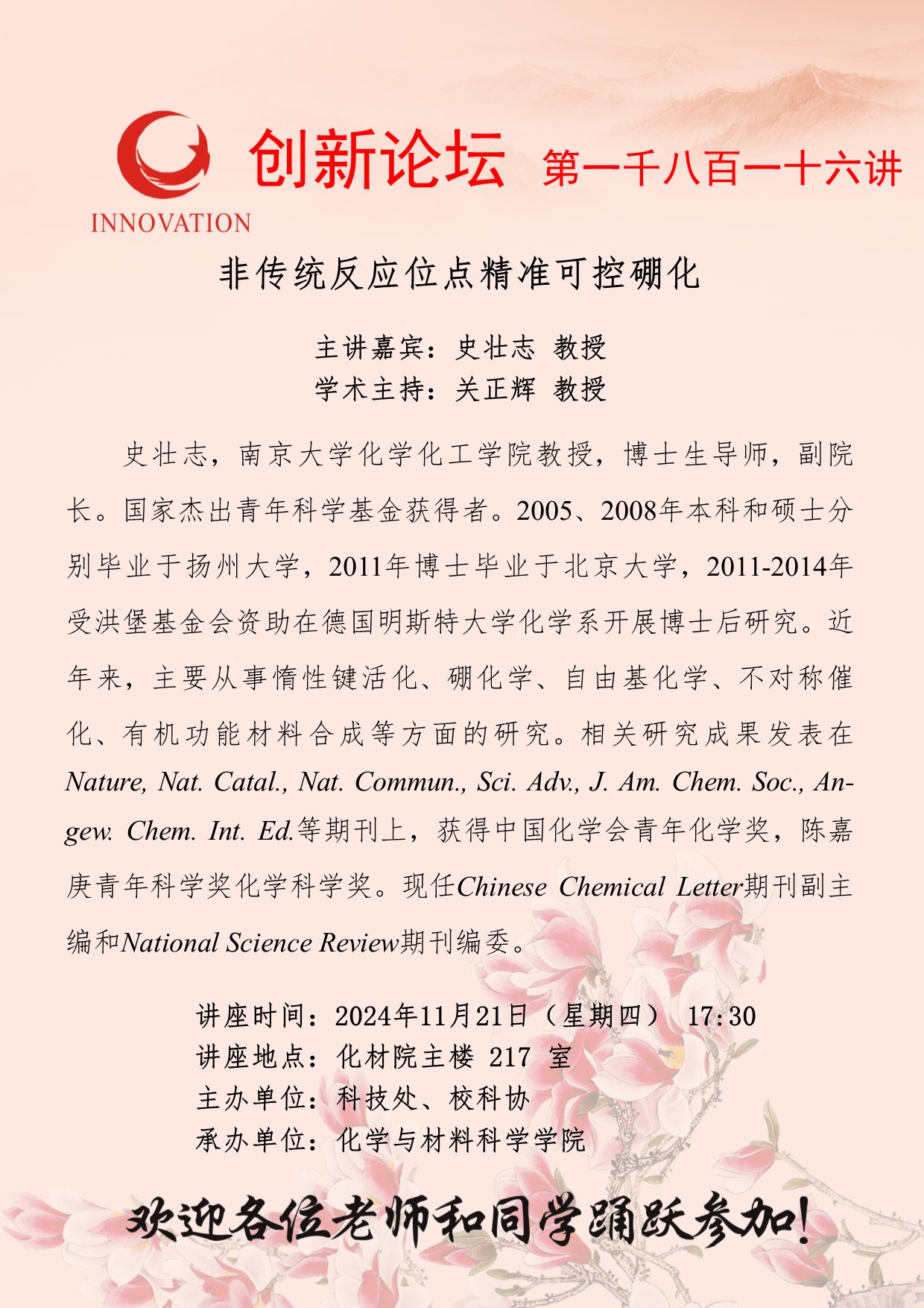 史壮志 教授 乐动网页版登录入口创新论坛第一千八百一十六讲:非传统反应位点精准可控硼化 讲座时间 2024年11月21日(星期四) 17:30 讲座地点 化材院主楼 217 室 讲座人介绍 史壮志 教授 讲座内容