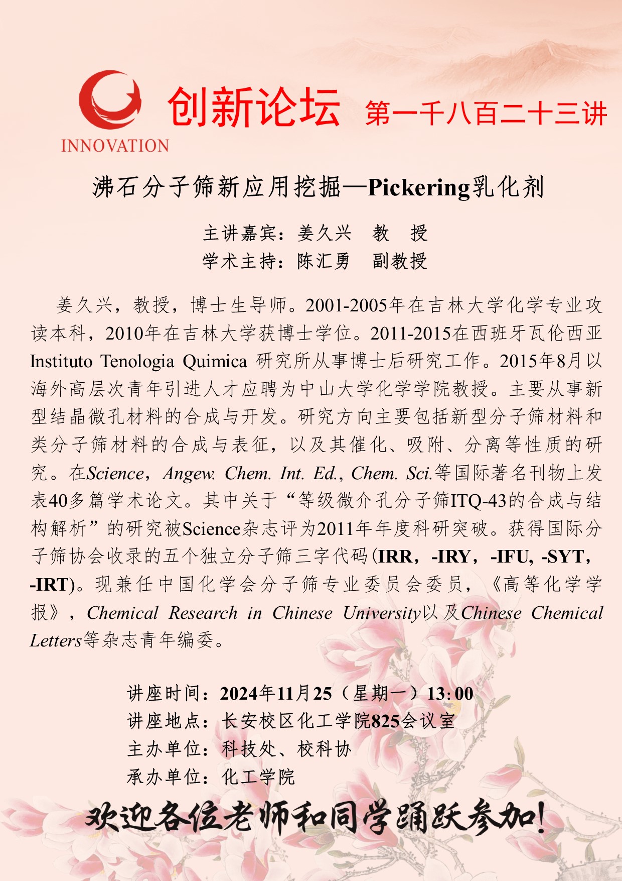 姜久兴 教授 乐动网页版登录入口创新论坛第一千八百二十三讲:沸石分子筛新应用挖掘—Pickering乳化剂 讲座时间 2024年11月25(星期一)13:00 讲座地点 乐动网页版登录入口长安校区化工学院825会议室 讲座人介绍 姜久兴 教授 讲座内容