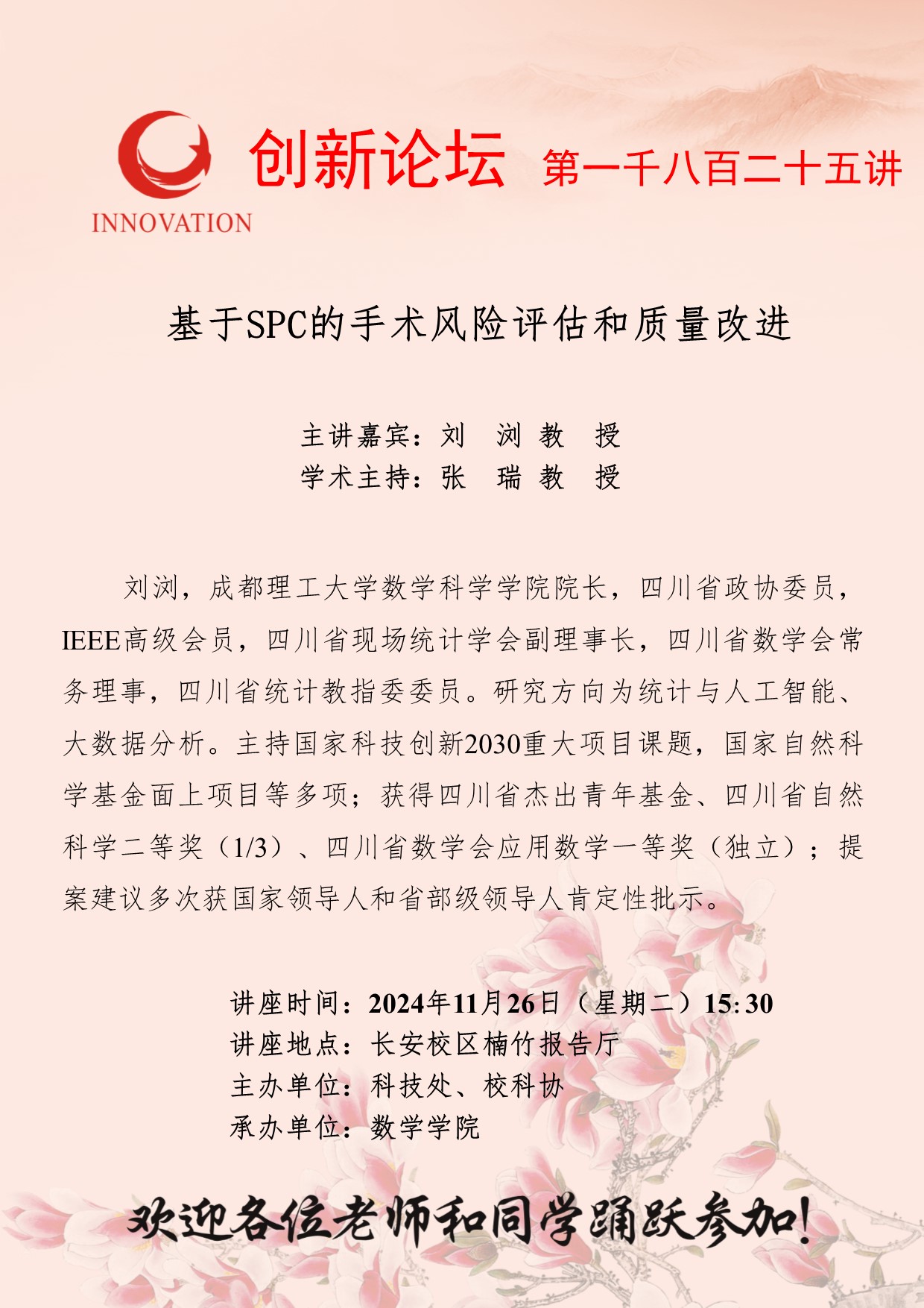 刘浏 教授 乐动网页版登录入口创新论坛第一千八百二十五讲:基于SPC的手术风险评估和质量改进 讲座时间 2024年11月26日(星期二)15:30 讲座地点 长安校区楠竹报告厅 讲座人介绍 刘浏 教授 讲座内容