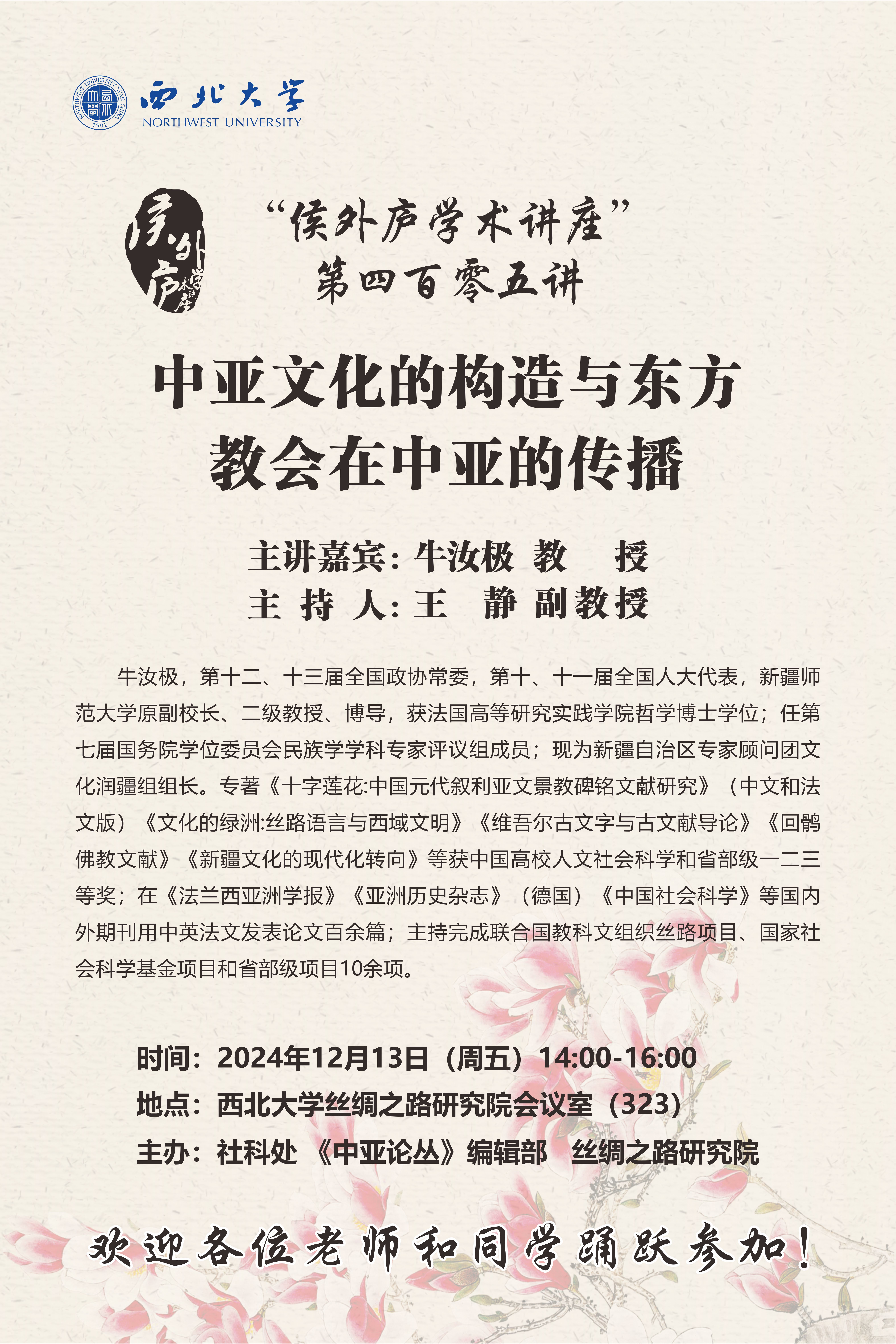 牛汝极 教授 “侯外庐学术讲座”第四百零五讲:中亚文化的构造与东方教会在中亚的传播 讲座时间 2024年12月13日(周五)14:00 讲座地点 丝绸之路研究院会议室(323) 讲座人介绍 牛汝极 教授 讲座内容