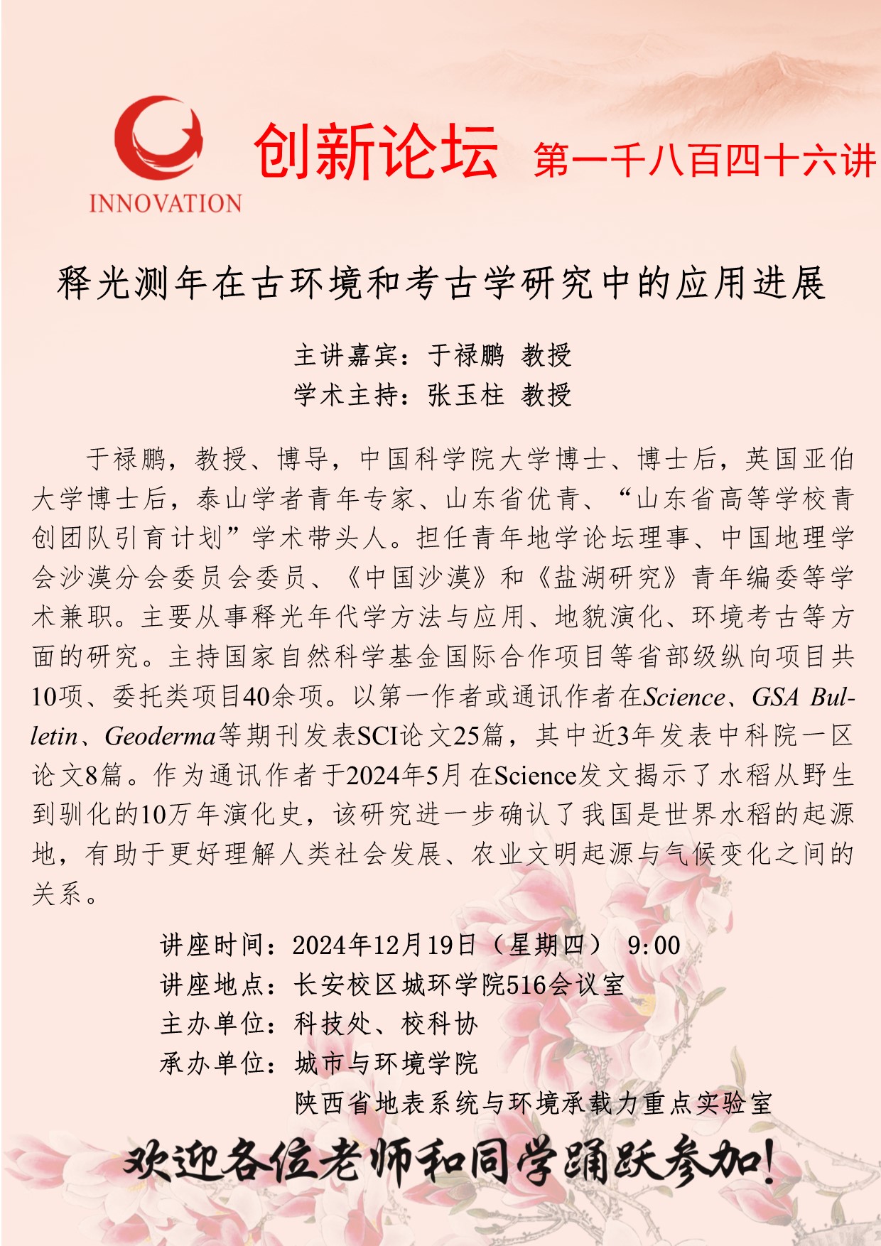 于禄鹏 教授 乐动网页版登录入口创新论坛第一千八百四十六讲:释光测年在古环境和考古学研究中的应用进展 讲座时间 2024年12月19日(星期四) 9:00 讲座地点 长安校区城环学院516会议室 讲座人介绍 于禄鹏 教授 讲座内容