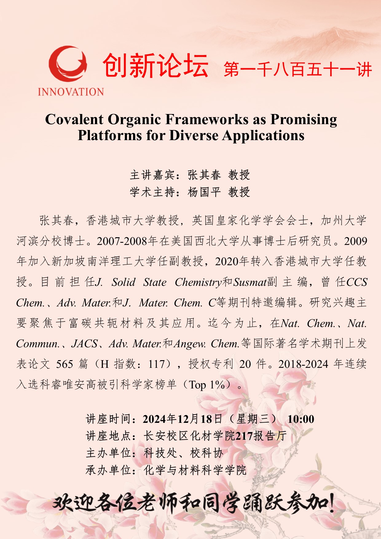 张其春 教授 乐动网页版登录入口创新论坛第一千八百五十一讲:Covalent Organic Frameworks as Promising Platforms for Diverse Applications 讲座时间 2024年12月18日(星期三) 10:00 讲座地点 长安校区化材学院217报告厅 讲座人介绍 张其春 教授 讲座内容