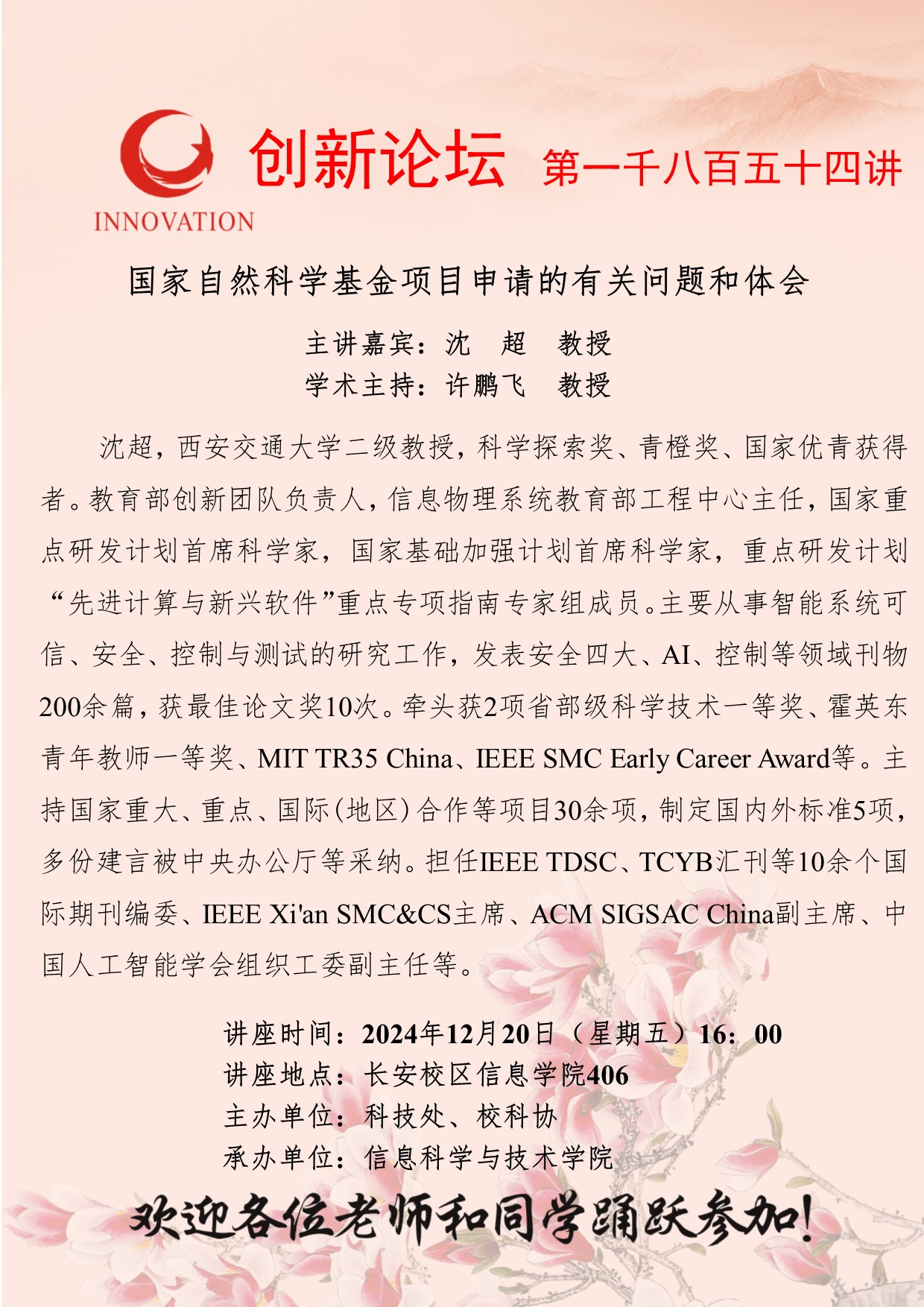 沈超 教授 乐动网页版登录入口创新论坛第一千八百五十四讲:国家自然科学基金项目申请的有关问题和体会 讲座时间 2024年12月20日(星期五) 16:00 讲座地点 长安校区信息学院406 讲座人介绍 沈超 教授 讲座内容
