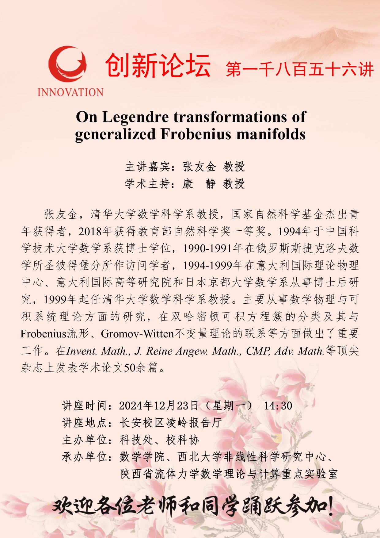 张友金 教授 乐动网页版登录入口创新论坛第一千八百五十六讲:On Legendre transformations of generalized Frobenius manifolds 讲座时间 2024年12月23日(星期一) 14:30 讲座地点 长安校区凌岭报告厅 讲座人介绍 张友金 教授 讲座内容