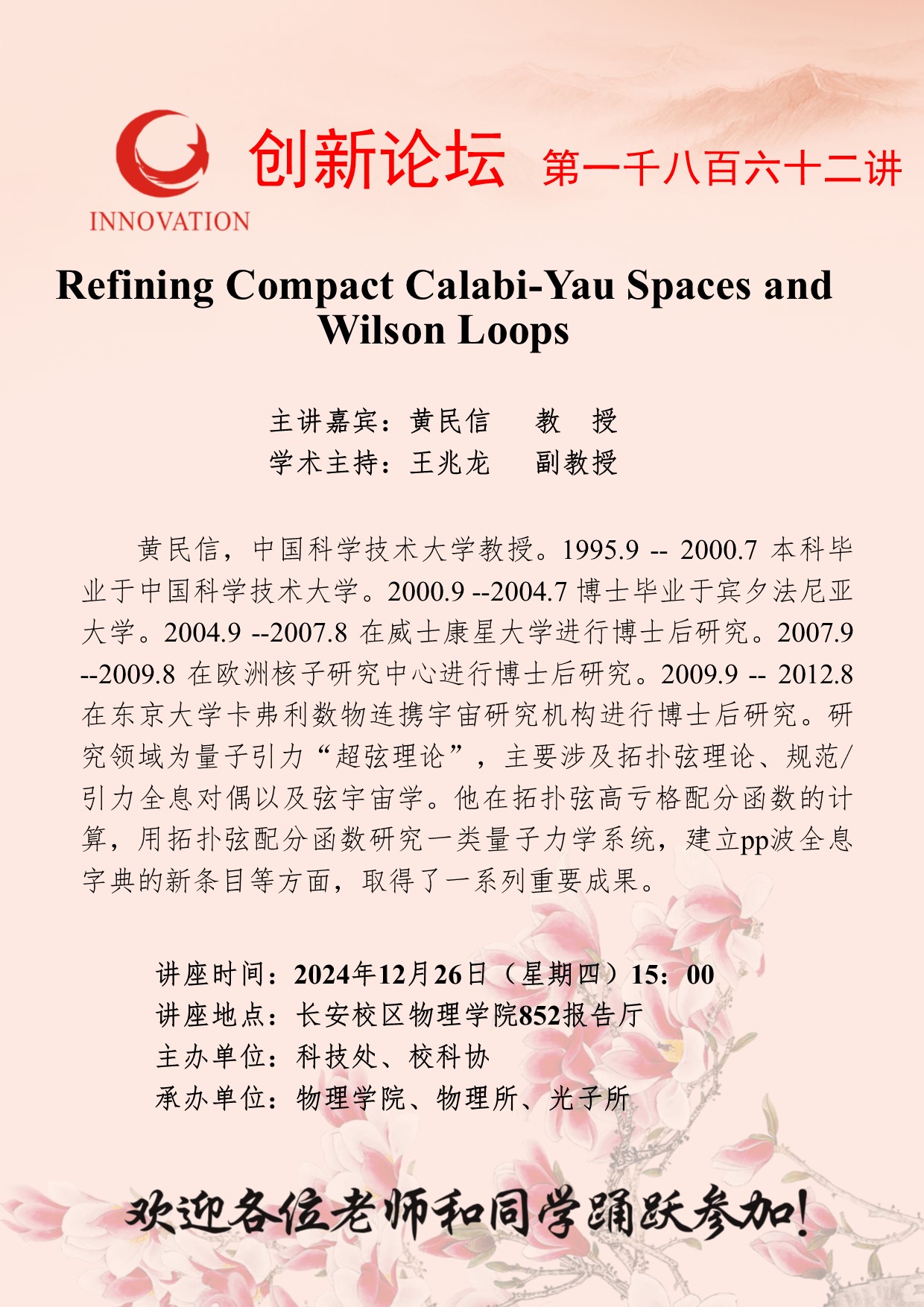 黄民信 教授 乐动网页版登录入口创新论坛第一千八百六十二讲:Refining Compact Calabi-Yau Spaces and Wilson Loops 讲座时间 2024年12月26日(星期四)15:00 讲座地点 长安校区物理学院852报告厅 讲座人介绍 黄民信 教授 讲座内容