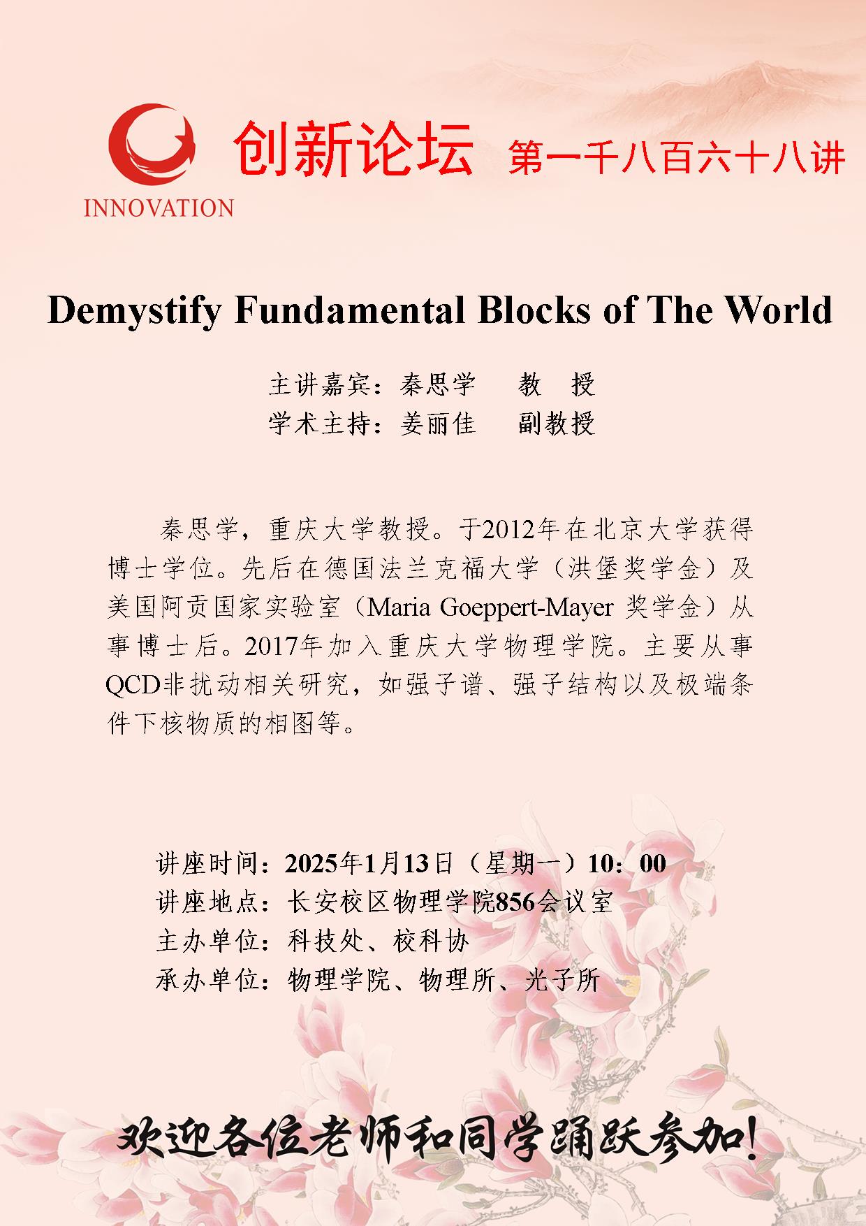 秦思学 教授 乐动网页版登录入口创新论坛第一千八百六十八讲:Demystify Fundamental Blocks of The World 讲座时间 2025年1月13日(星期一)10:00 讲座地点 长安校区物理学院856会议室 讲座人介绍 秦思学 教授 讲座内容