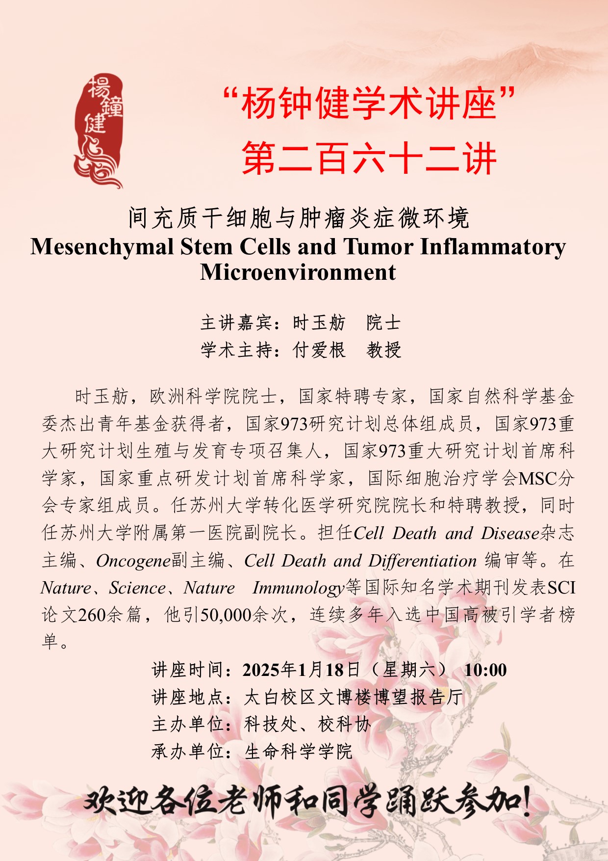 “杨钟健学术讲座”第二百六十二讲:间充质干细胞与肿瘤炎症微环境(Mesenchymal Stem Cells and Tumor Inflammatory Microenvironment)