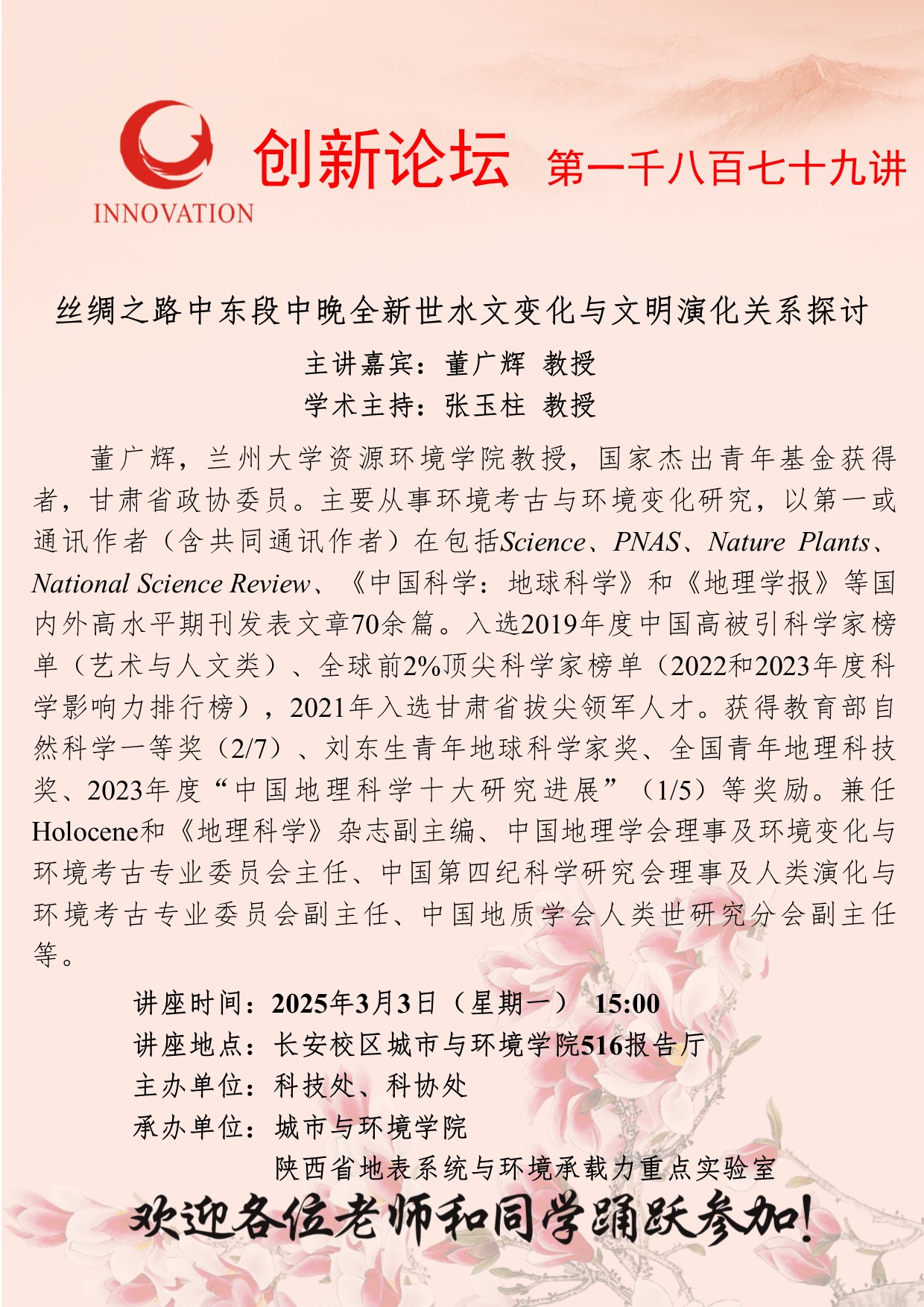 董广辉 教授 乐动网页版登录入口创新论坛第一千八百七十九讲:丝绸之路中东段中晚全新世水文变化与文明演化关系探讨 讲座时间 2025年3月3日(星期一) 15:00 讲座地点 长安校区城市与环境学院516报告厅 讲座人介绍 董广辉 教授 讲座内容