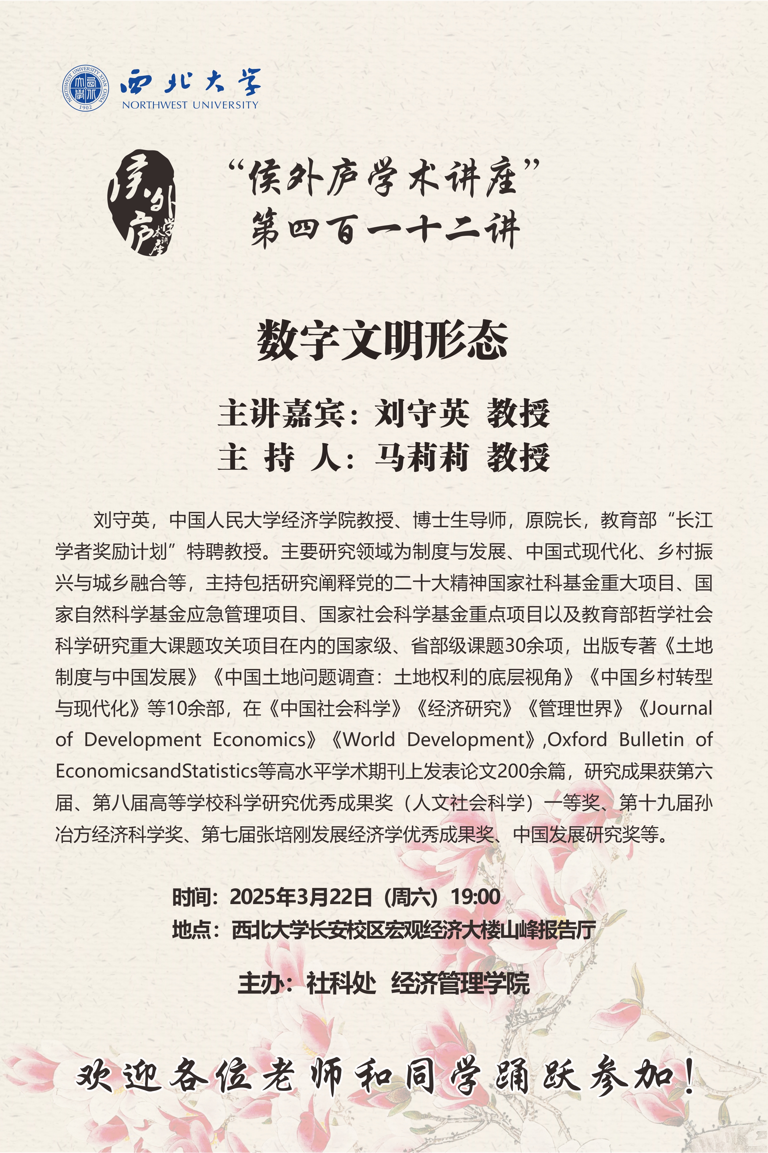 刘守英教授 “侯外庐学术讲座”第四百一十二讲:数字文明形态 讲座时间 2025年3月22日(周六)19:00 讲座地点 乐动网页版登录入口长安校区宏观经济大楼山峰报告厅 讲座人介绍 刘守英教授 讲座内容