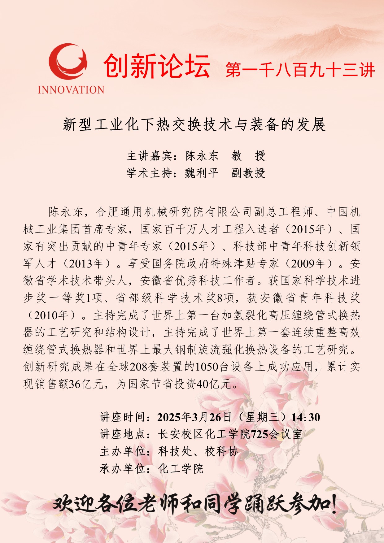 陈永东 教授 乐动网页版登录入口创新论坛第一千八百九十三讲:新型工业化下热交换技术与装备的发展 讲座时间 2025年3月26日(星期三)14:30 讲座地点 长安校区化工学院725会议室 讲座人介绍 陈永东 教授 讲座内容