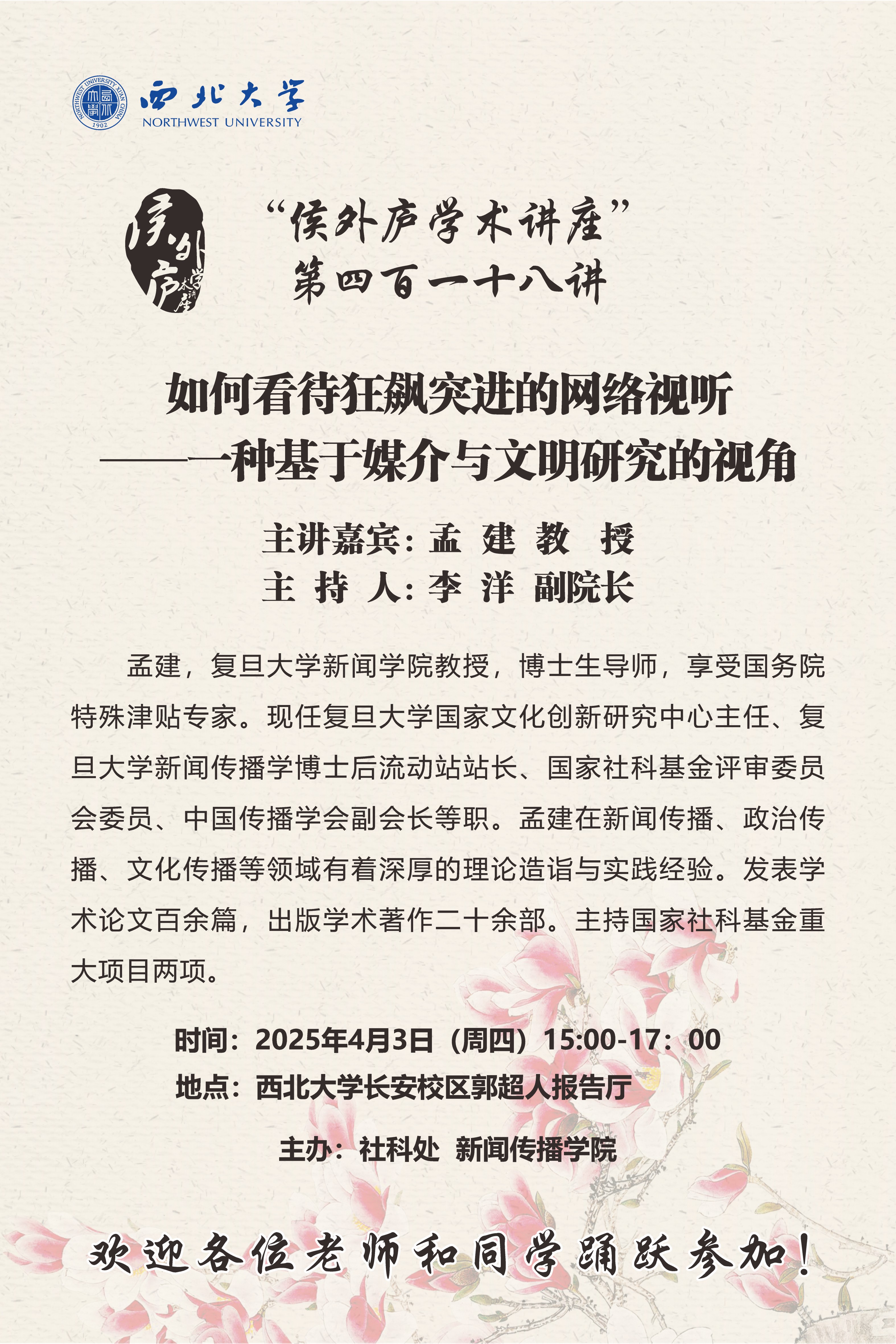 孟建 教授 “侯外庐学术讲座”第四百一十八讲:如何看待狂飙突进的网络视听——一种基于媒介与文明研究的视角 讲座时间 2025年4月3日(周四)15:00-17:00 讲座地点 乐动网页版登录入口长安校区郭超人报告厅 讲座人介绍 孟建 教授 讲座内容