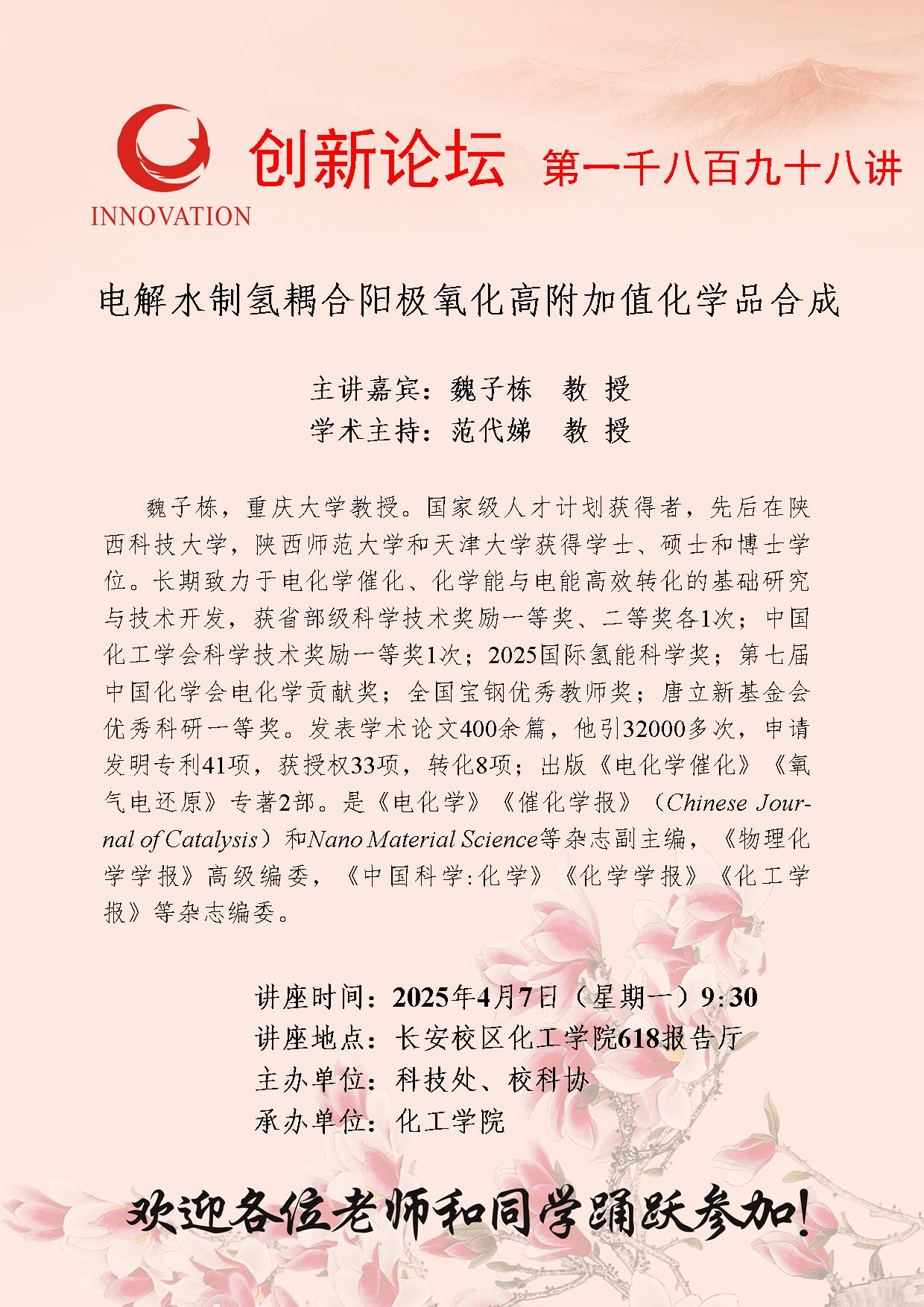 魏子栋 教授 乐动网页版登录入口创新论坛第一千八百九十八讲:电解水制氢耦合阳极氧化高附加值化学品合成 讲座时间 2025年4月7日(星期一)9:30 讲座地点 长安校区化工学院618报告厅 讲座人介绍 魏子栋 教授 讲座内容